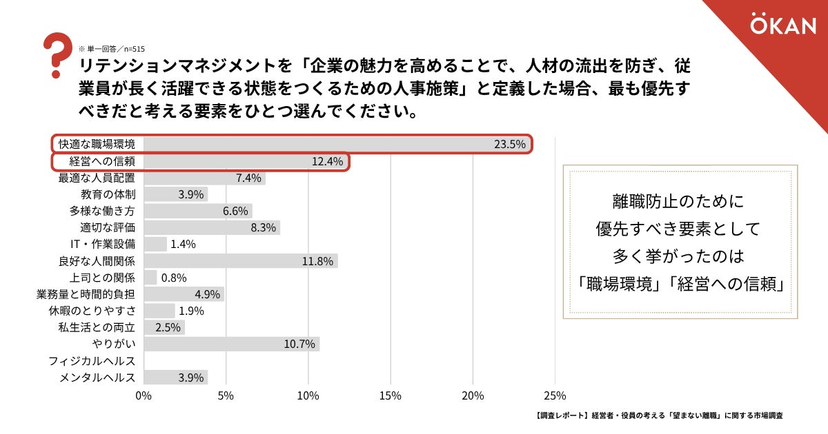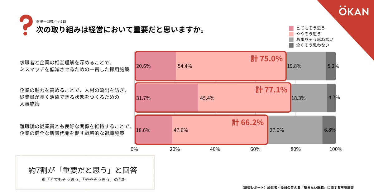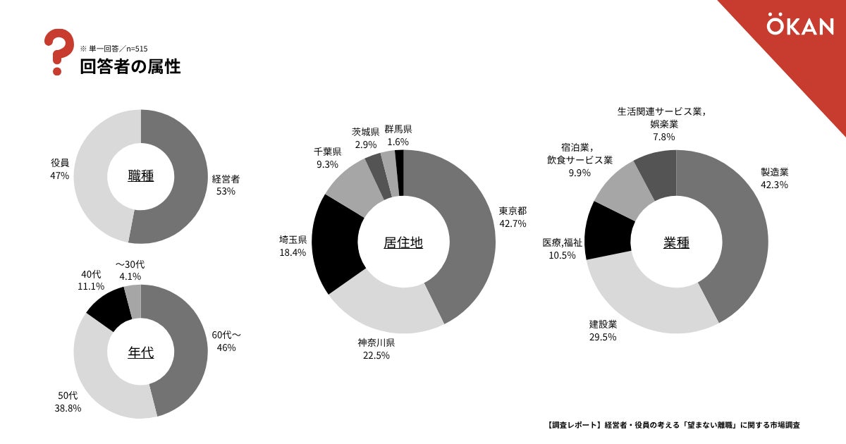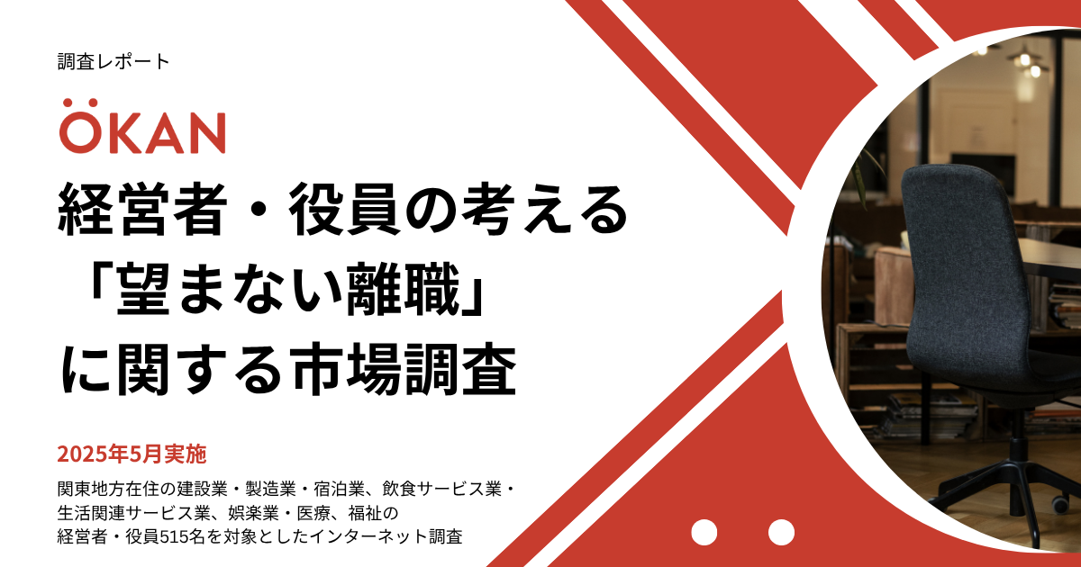 「望まない離職」を生まない組織づくりを支援する株式会社OKAN(本社:東京都豊島区、代表取締役:沢⽊恵太、以下OKAN)は、ノンデスクワーカーやエッセンシャルワーカーが働く企業※の経営に携わる関東地方在住の経営者・役員515名を対象に、「望まない離職」に関する市場調査を行いました。