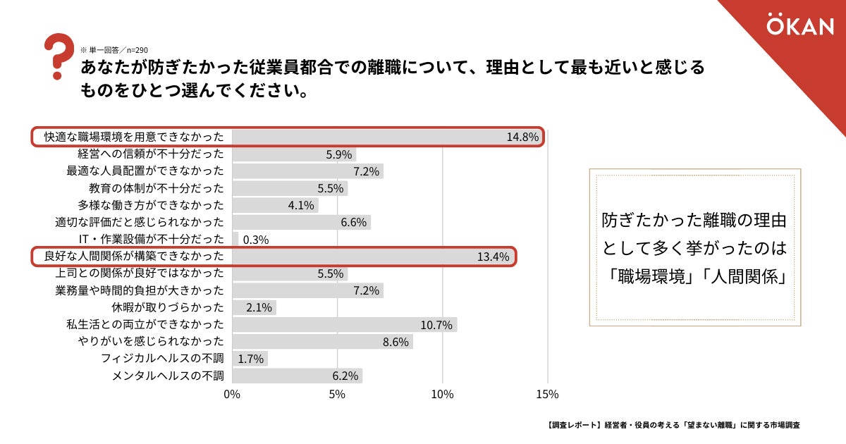「快適な職場環境を用意できなかった」(14.8%)と「良好な人間関係が構築できなかった」(13.4%)が、経営者・役員が「防ぎたかった離職」の主要因