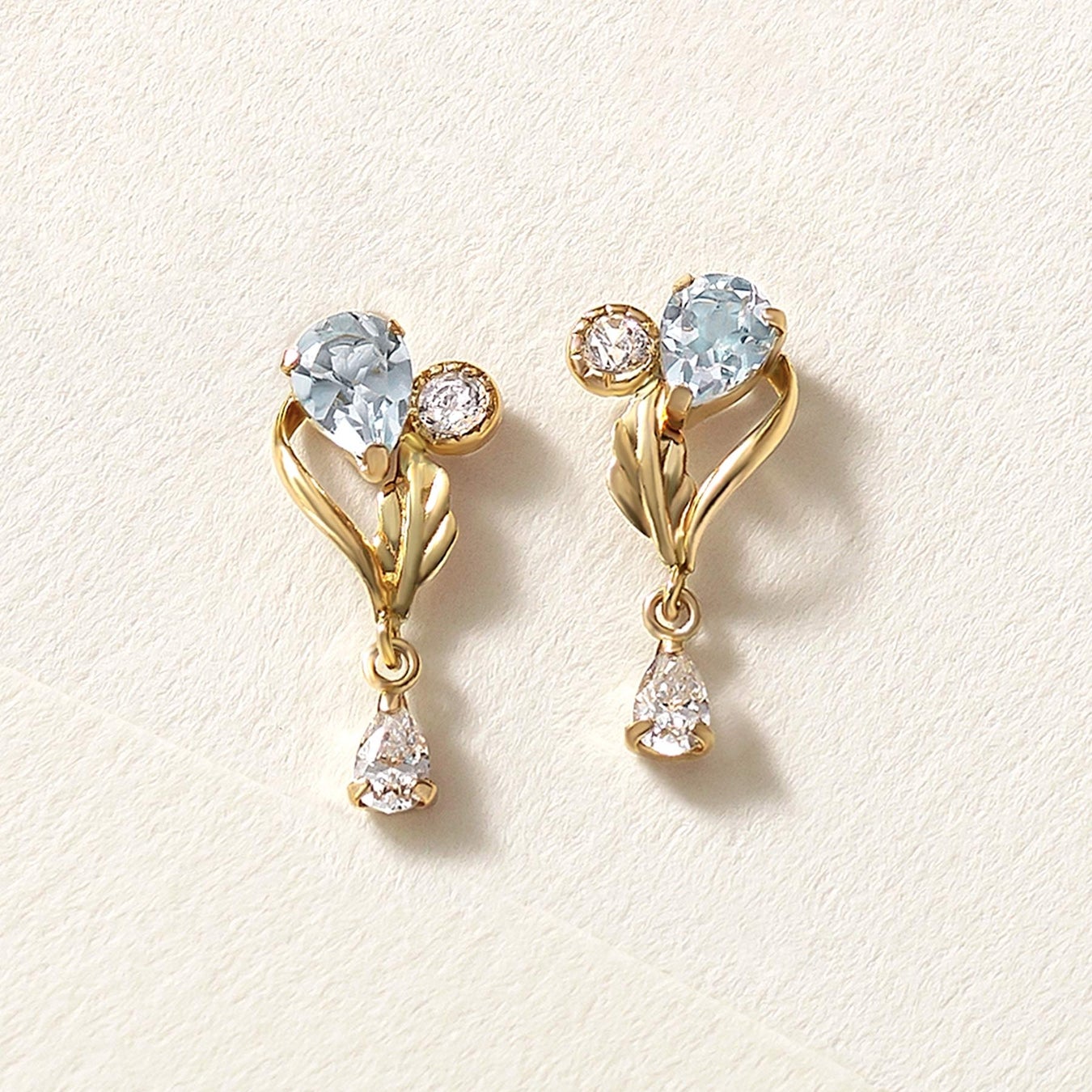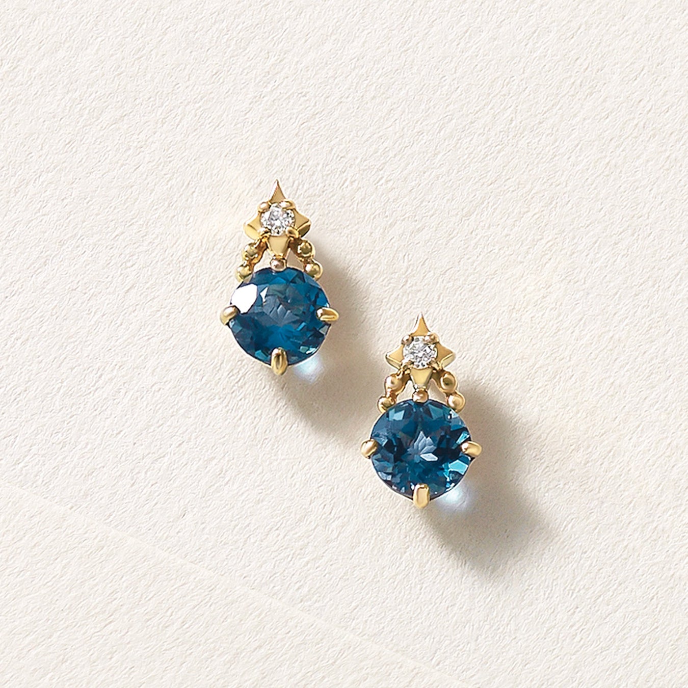 願いを叶える流れ星をイメージした「シューティングスター」は、ディープブルーの輝きが美しいロンドンブルートパーズが目を惹くセットアップ。 石枠を二段にすることでサイドから光を取り入れ、石の輝きと透明感を引き立てます。スカイブルートパーズが煌めくショートスイングピアス「メリー」はクリスマスツリ―を表現したリーフモチーフで、イルミネーションに心が躍る様子を表現しました。