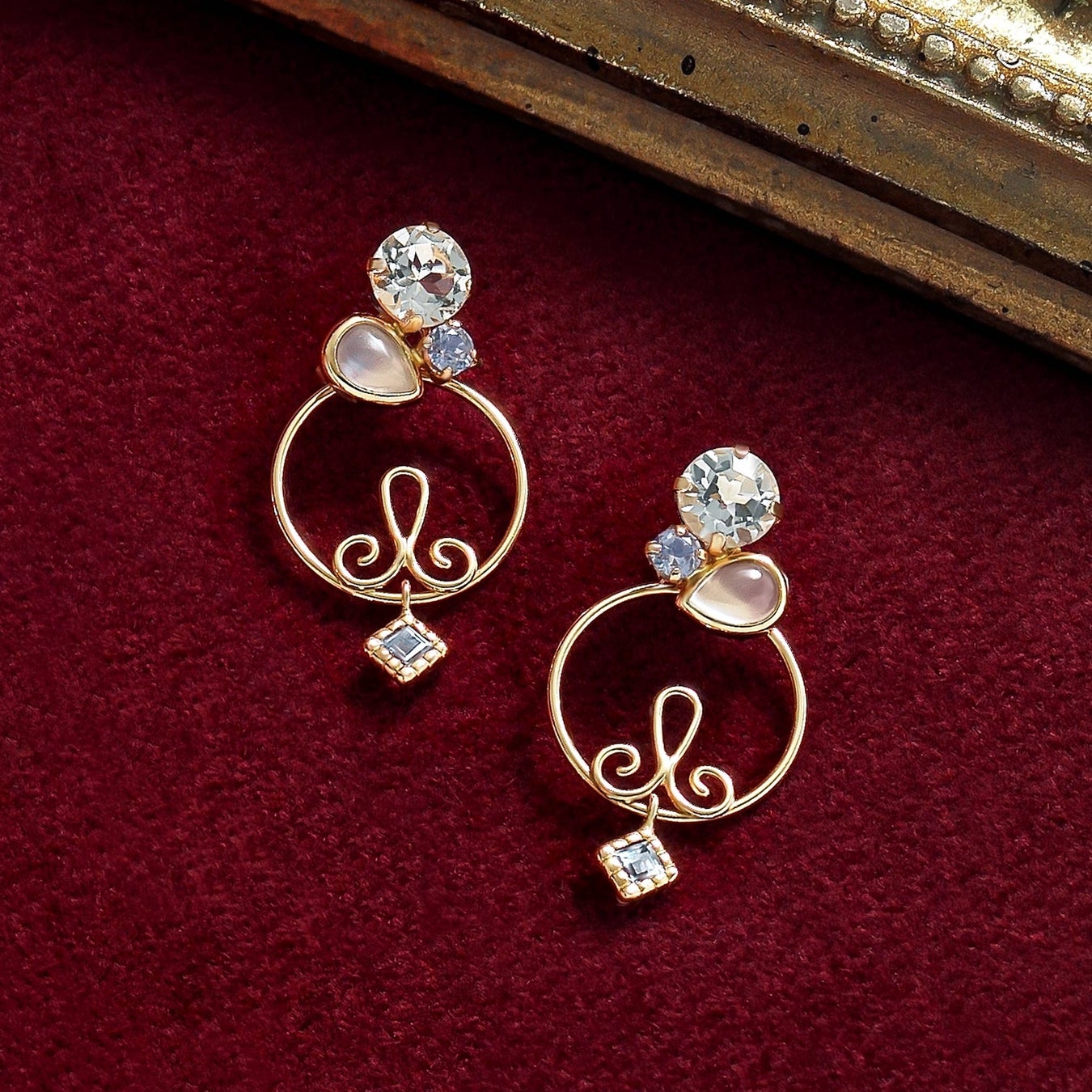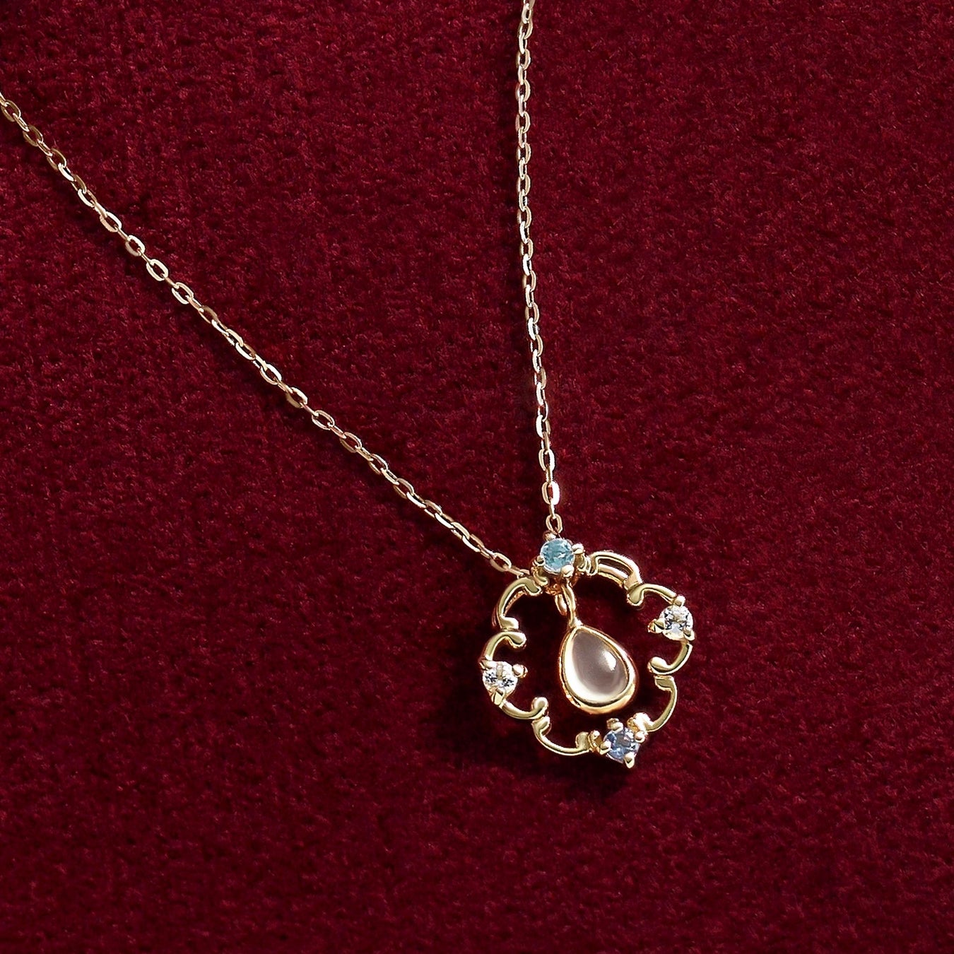 幸せを呼ぶといわれるヨーロッパの伝統的な砂糖菓子入れ「ボンボニエール」をモチーフにしたセットアップ。全て天然石を使用し、ホワイトトパーズ、ムーンストーン、タンザナイトで色鮮やかな甘い砂糖菓子を表現。丸い形は可愛らしい小物入れとしてのシルエットをイメージしました。ネックレスはフレームを、ピアス・イヤリングはチャームを外してシンプルなスタイルでもお楽しみいただける2WAY仕様です。