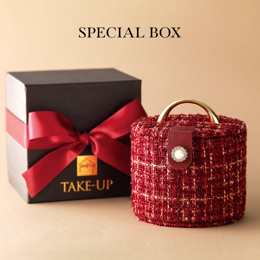Winter Collection 『Dear..』のアイテムまたは税込27,500円以上のお求めで、スペシャルボックスをプレゼント。トレンド感のある赤いツイード柄が目を惹く特別感溢れるデザインです。