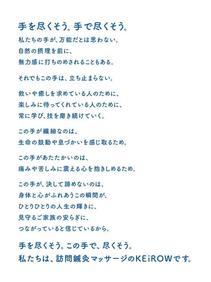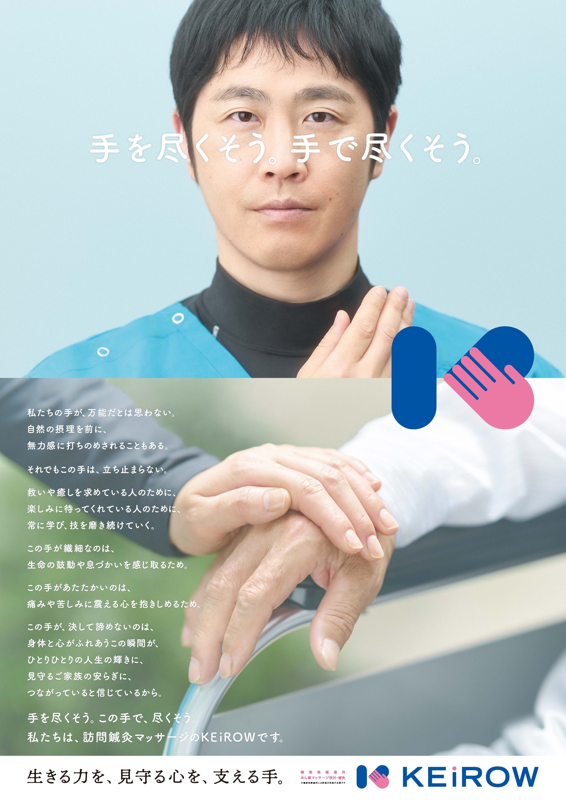2013年9月よりフランチャイズ事業として開始し、今年で10年となり大きな節目を迎えます。超高齢社会を進む現在の日本は、今後より介護が不可欠になってくると見られていますが、その中でご利用者様を支えるサービスの一つとして、訪問鍼灸マッサージ「KEiROW」が必要だと考えます。今回のリブランディングでは、10年を一つの節目とすることと、今後さらに、「介護現場に寄り添ったサービス」「人の手を尽くしたサービス」として「KEiROW」がみなさまに認知されていくことを目指し、介護の現場で献身する施術師の方々にスポットを当てたステートメントを作成し、ロゴの刷新を行うこととなりました。