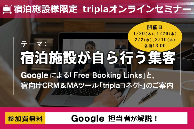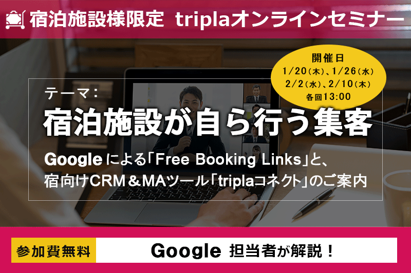 【宿泊施設向け・オンライン無料自社集客セミナー開催】『Google担当者解説による「Free Booking Links」と宿向けCRM & MAツール「tripla コネクト」のご案内』