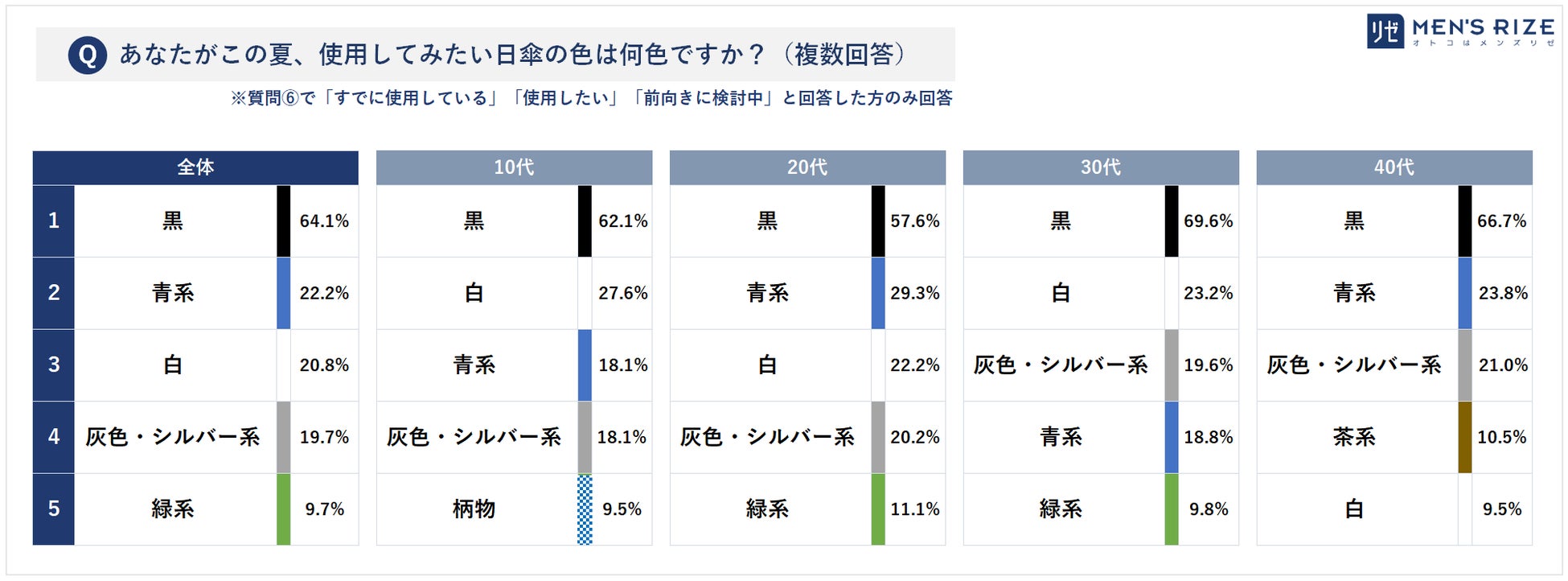 ⑦【男性が使用したい日傘の色トップ3】①黒(64.1%) ②青系(22.2%) ③白(20.8%)