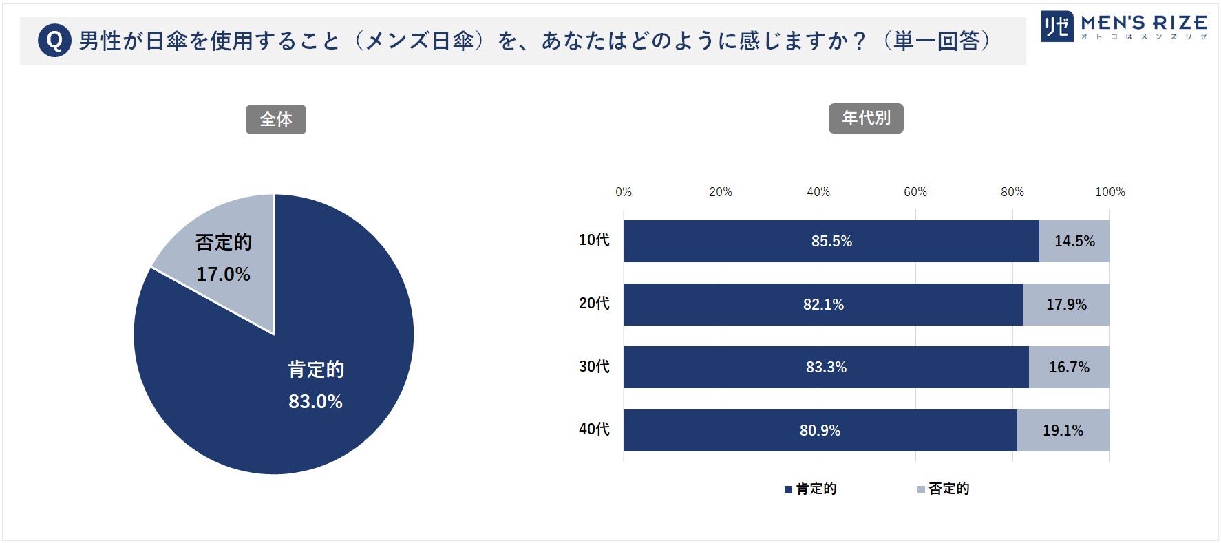【メンズ日傘】については、男性の4割が「日傘男子を見たことがある」と回答。男性の8割以上が【日傘男子】を「肯定的」に感じており、「肯定派」は昨年同時期に行った調査より3.3ポイント増加しました(2022年:79.7% → 2023年:83.0%)。