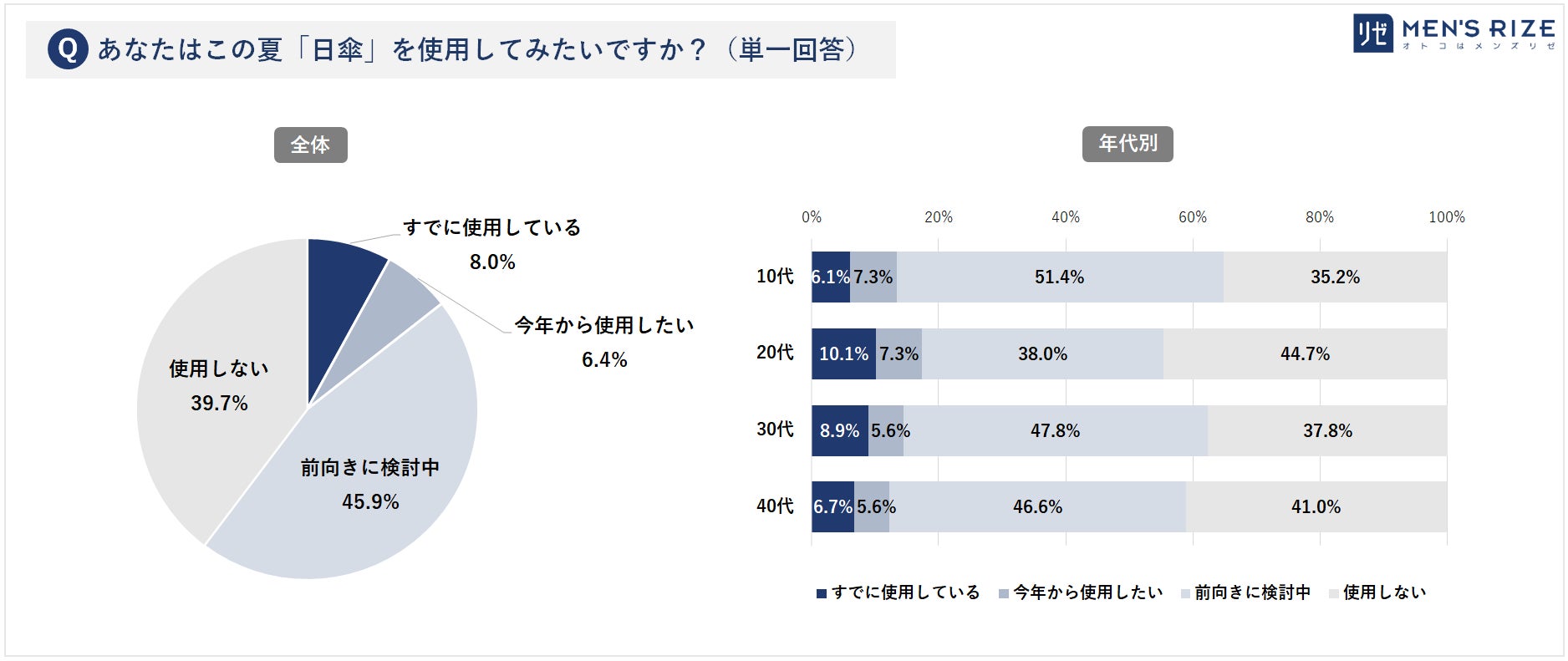 この夏はマスク、つける?つけない? 脱マスク時の紫外線対策は? 男性の日傘どう思う? 使用したい日傘の色は? 脱マスクでヒゲ剃り頻度は変わる? 挑戦したい美容は?ほか、10~40代の男性716名へ調査