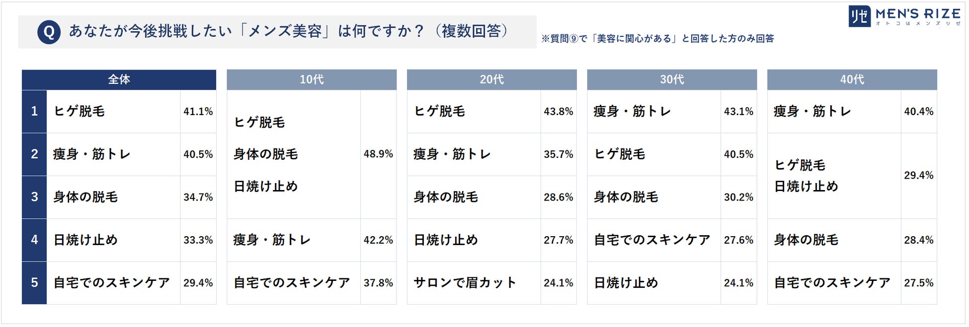 ⑩【今後挑戦したい「メンズ美容」は?】①ヒゲ脱毛(41.1%)②痩身・筋トレ(40.5%)③身体の脱毛(34.7%)