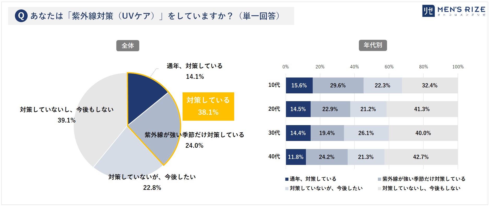 また4割の男性が「紫外線対策をしている」と回答。世代別では10代が最多で約半数がUVケアを行う一方で、40代男性の4割以上は「日焼け対策に関心がない」ことが分かりました。