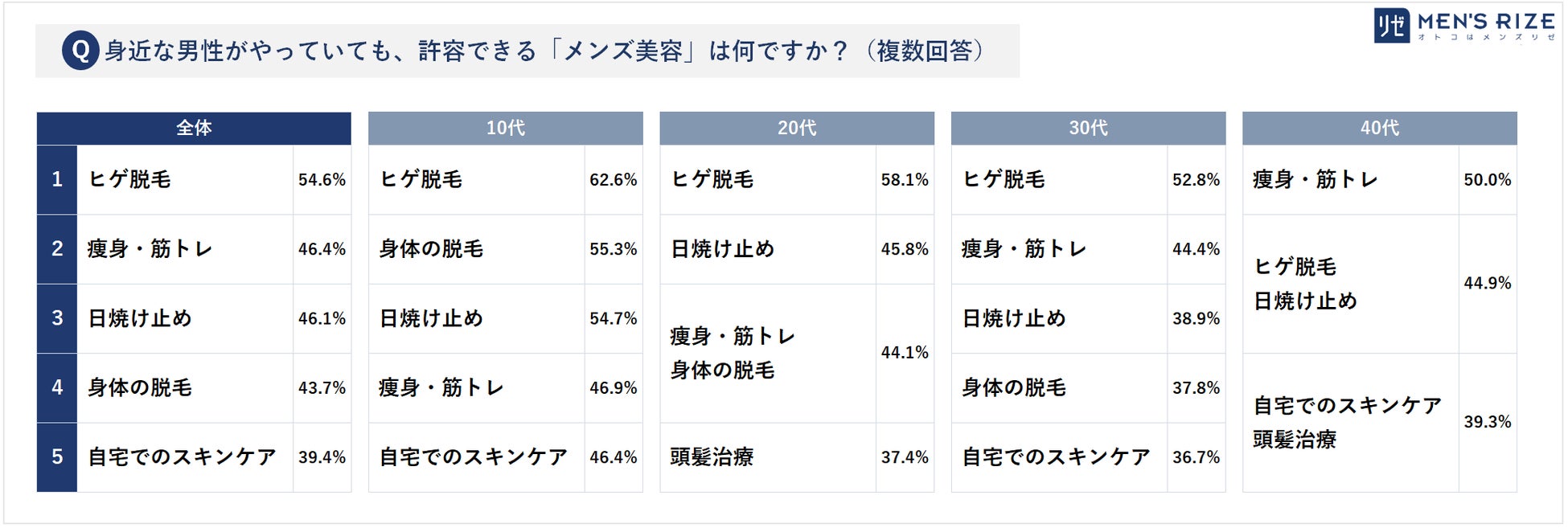 ◎10代はトップに「ヒゲ脱毛(62.6%)」、次点に「身体の脱毛(46.9)」と、「脱毛」が1位・2位にランクイン。世代が若くなるにつれ「ヒゲ脱毛」や「全身脱毛」など脱毛への許容率が高くなる結果に