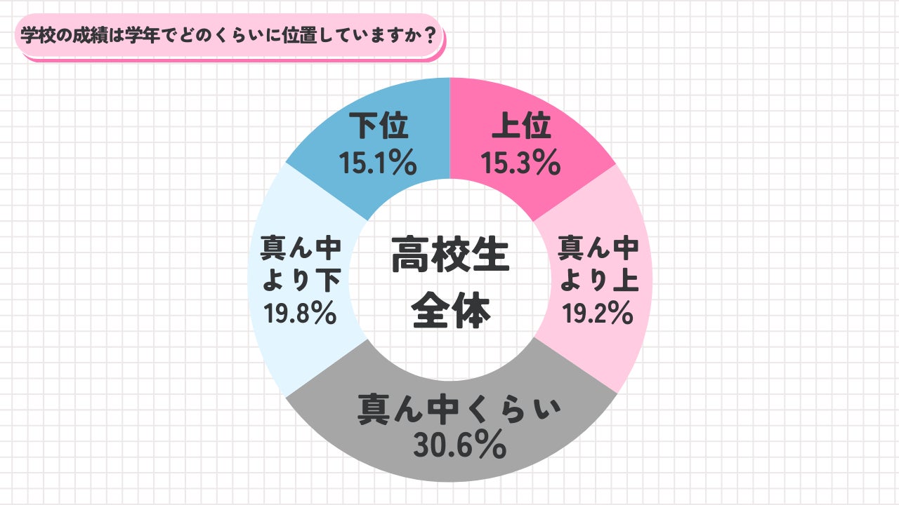 学校での成績を聞いたところ、上位・下位の分布はほぼ均等になりました。ミスコン・ミスターコンの出場者に学校成績の偏りはほとんどなく、さまざまな層の高校生が参加していることが分かります。