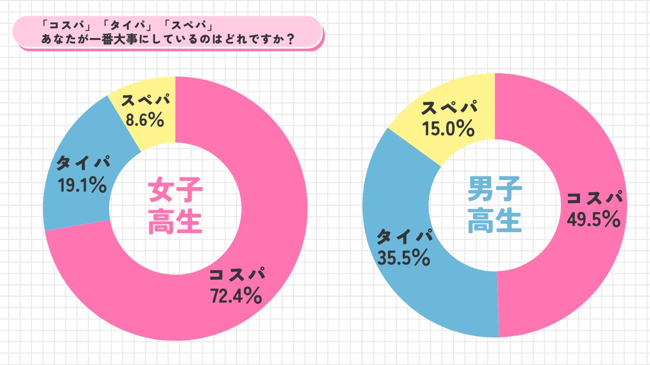一方、男子は「コスパ」と回答したのが49.5%と女子よりは少ないものの、ほぼ半数近くがコスパを重視しているようです。またその他の「タイパ(タイムパフォーマンス/時間対効果)」「スペパ(スペースパフォーマンス/空間対効果)」と答えた割合が比較的高いという結果でした。男子は女子と比べるとお金よりも時間や空間の重要性に目を向ける傾向があり、普段の生活における価値観にやや違いがあると言えるでしょう。