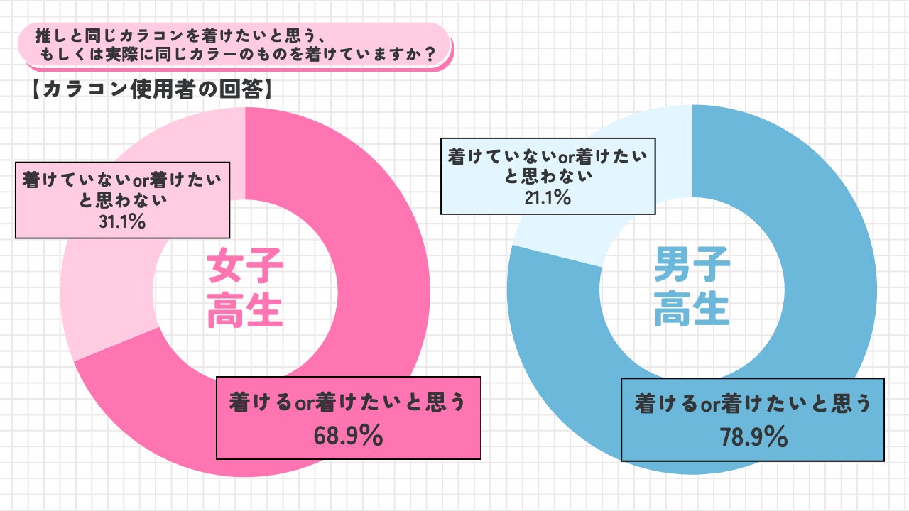 その結果、男女ともに65%以上の高校生が「着けるor着けたいと思う」と回答。特に男子高生は78.9%とかなり高い割合で「推しと同じカラコン」に魅力を感じていることが分かりました。