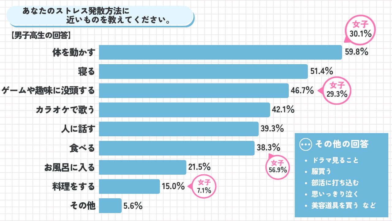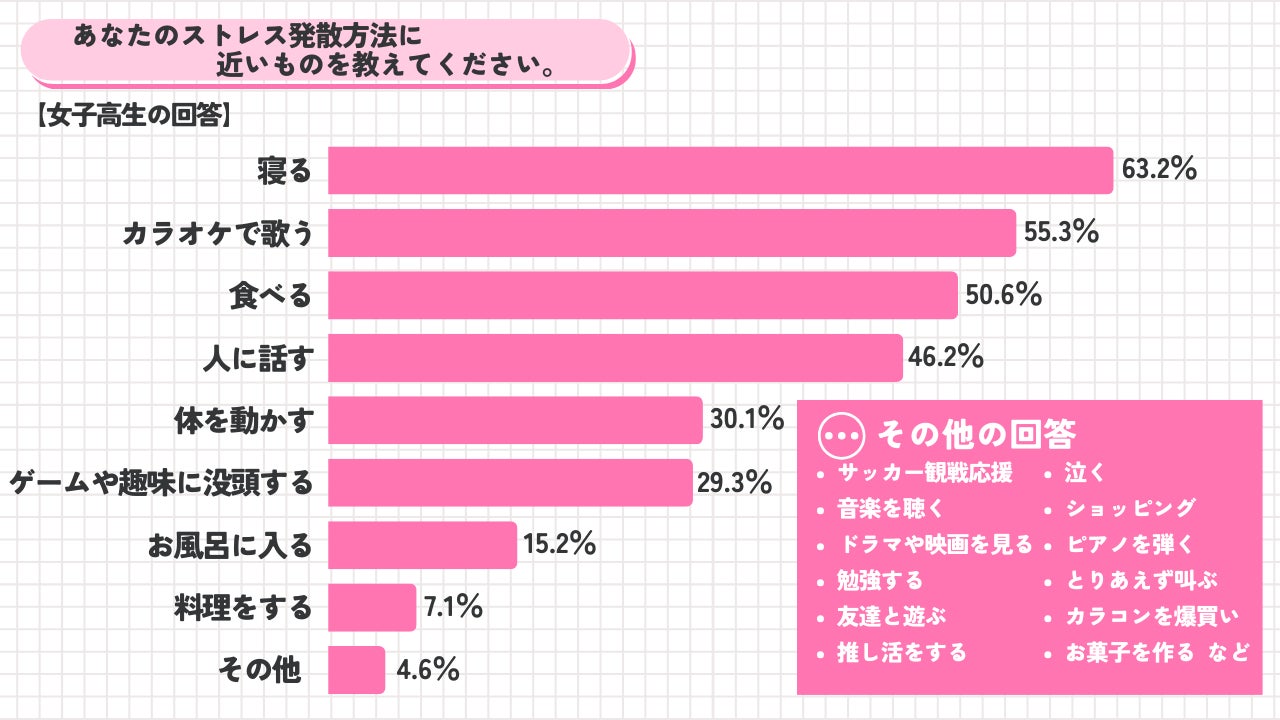 「その他」の回答では「サッカー観戦応援」「推し活」「カラコンを爆買い」など、ユニークな方法でストレス発散をしている女子高生もいることが分かりました。