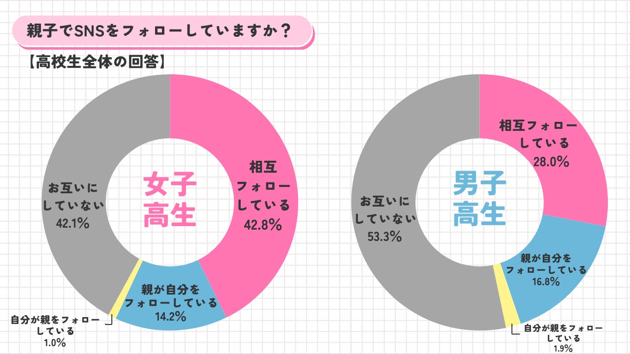 親子でSNSを相互フォローしている高校生は女子42.8%、男子28.0%と、女子の方が親とSNSで繋がりを持っている割合が高いことが明らかになりました。親か自分の「片思いフォロー」も含めると58.0%の女子高生がSNS上で親と関わりを持っており、家族ともSNSで親密にコミュニケーションを取る傾向が強いことが示唆されました。