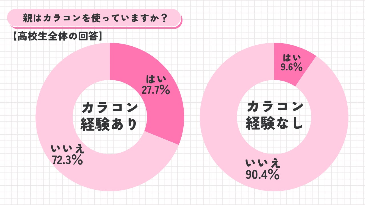 カラコンを使ったことのある高校生は27.7%が「はい(親もカラコンを使っている)」と回答、一方カラコンを着けた経験がない高校生は「はい」と答えた割合がわずか9.6%でした。カラコンを着けた経験がある高校生は親もカラコンを着けた経験があると回答した割合が比較的高く、カラコンを着けるかどうかはある程度親の影響を受けることが推測されます。