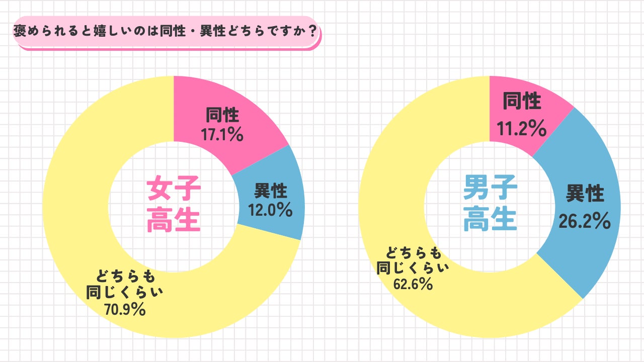 その一方で、同性もしくは異性と回答した高校生の比率はそれぞれ男女で異なる傾向が見られました。女子高生は「同性(17.1%)」、男子高生は「異性(26.2%)」の割合が高く、総合すると男女どちらも「女子に褒められる方が嬉しい」と回答しているという結果になりました。