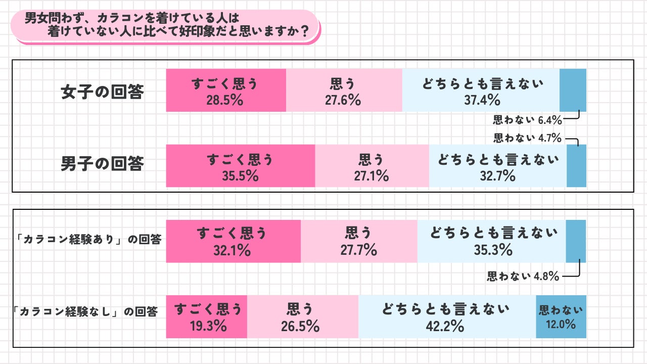 また、「カラコンを着けた経験がある」と回答したかどうかで割合を比較すると、カラコンを着けた経験がある高校生の方が、好印象を抱いている割合が高いことが分かります。