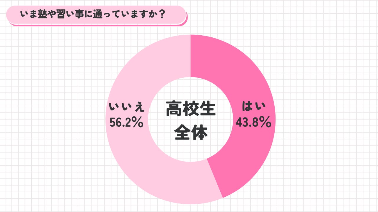 「いま塾や習い事に通っていますか?」という質問に対して「はい」と回答した高校生は43.8%。半分以上は習い事をしておらず、部活やアルバイトに励んでいる高校生も多いのかもしれません。