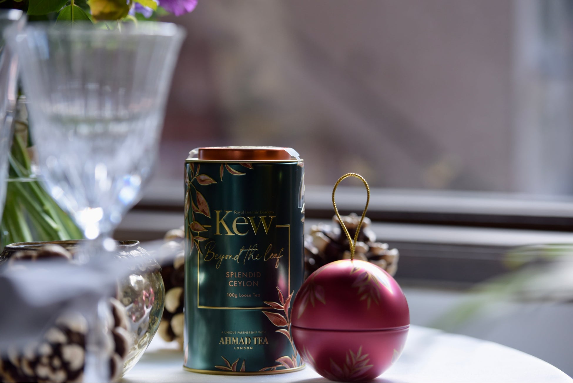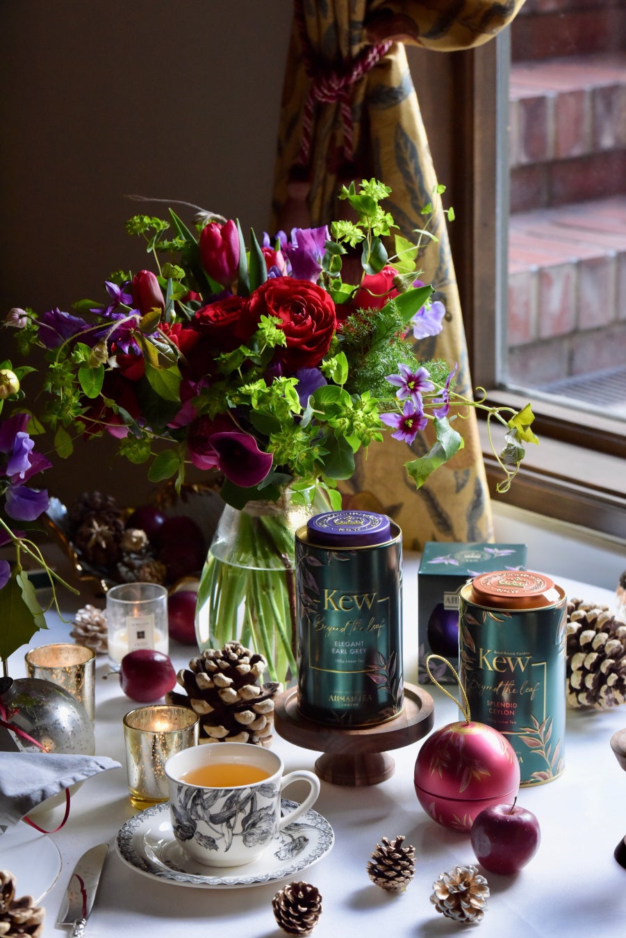 クリスマスにピッタリな花束と、アーマッドティーの英国王立植物園「キューガーデン」シリーズの紅茶をセットにしました。紅茶はクリスマス限定の「キューガーデンズ オーナメント缶(25g)」1種類と「キューガーデンズ リーフティー缶(100g)」1種類をそれぞれ一つずつ組み合わせて、花束と一緒にお送りします。ご自宅でのパーティーでも、ご友人やご家族へのプレゼントにも最適です。