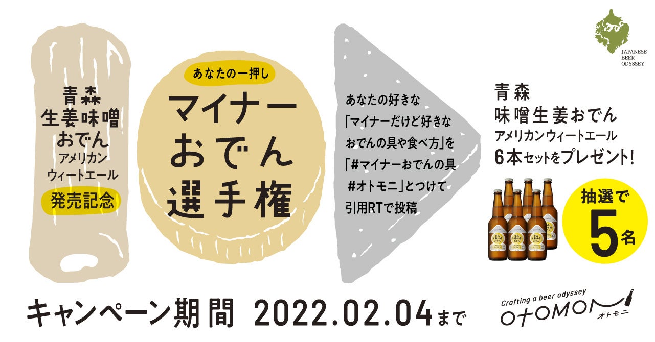 クラフトビール定期便「Otomoni(オトモニ)」を運営するmeuron株式会社(本社:東京都豊島区 代表取締役:金澤俊昌)は、クラフトビールを通じて新旧の日本文化を再発見する体験を定期便で提供する「JAPANESE BEER ODYSSEY」にて、オトモニ限定オリジナルクラフトビール第四弾の青森県名物「生姜味噌おでん」と合うクラフトビール「青森生姜味噌おでんアメリカンウィートエール」を販売開始いたします。
