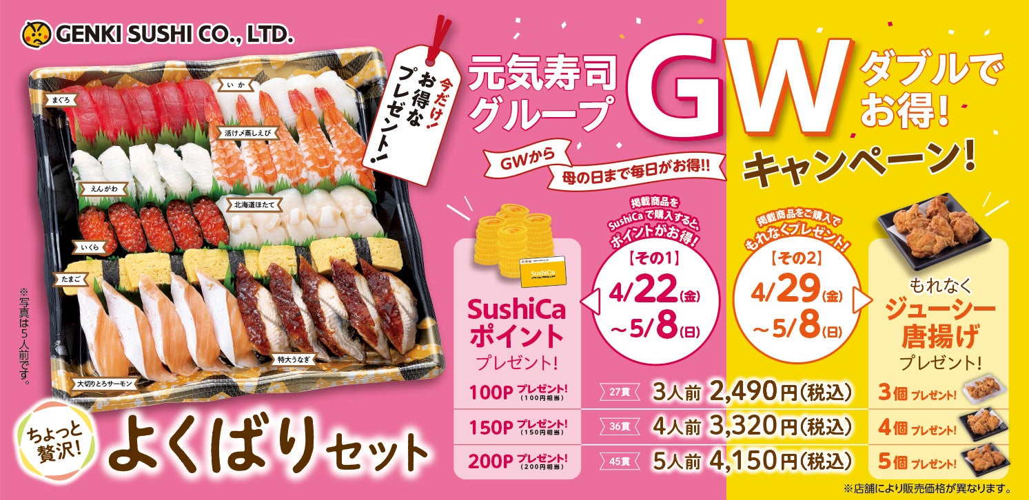 寿司レストランチェーンを展開する元気寿司株式会社(本社:栃木県宇都宮市 代表取締役社長 法師人尚史)は、2022年4月22日(金)~5月8日(日)の17日間、「ちょっと贅沢!よくばりセット」をご購入いただいた方を対象に、元気寿司グループ各店舗(※)でのお支払いで利用可能なオリジナル電子マネー「SushiCaポイント贈呈」や「ジューシー鶏もも唐揚げ」をプレゼントする今だけお得な「元気寿司グループ(G)ダブル(W)でお得!キャンペーン」を実施いたします。