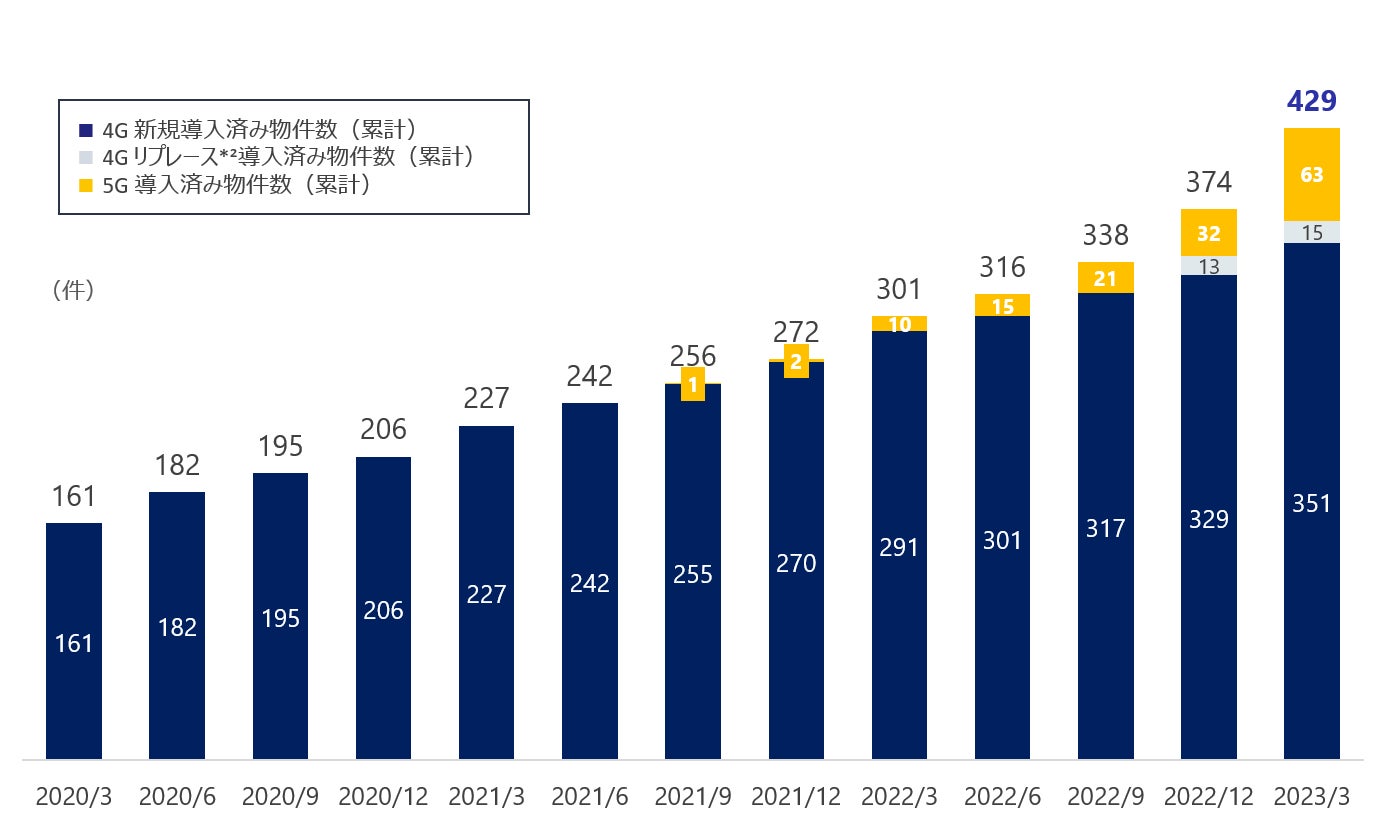 2023年3月時点の導入済物件数(4G/5G、国内)は429 件(前年同期比142.5%)となりました。うち5Gは63件となり、前年同期(10件)から順調に増加しました。