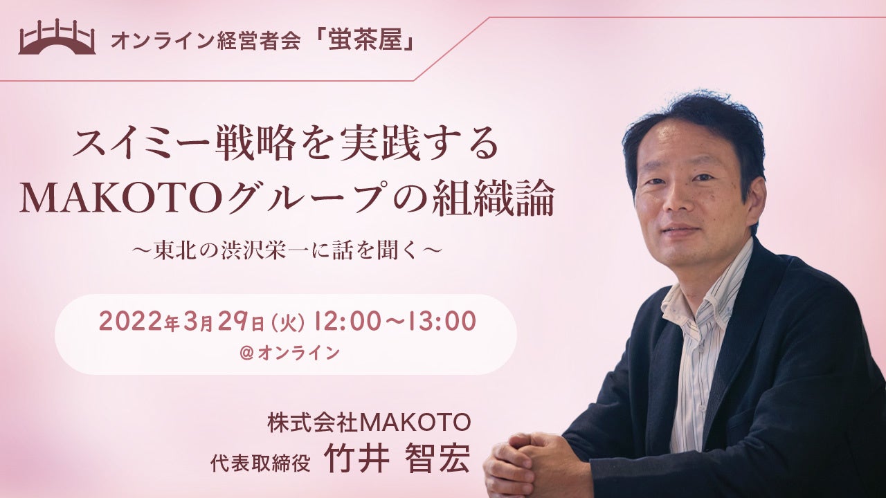 2022年3月29日(火) 蛍茶屋主催「スイミー戦略を実践するMAKOTOグループの組織論 ~東北の渋沢栄一に話を聞く~」