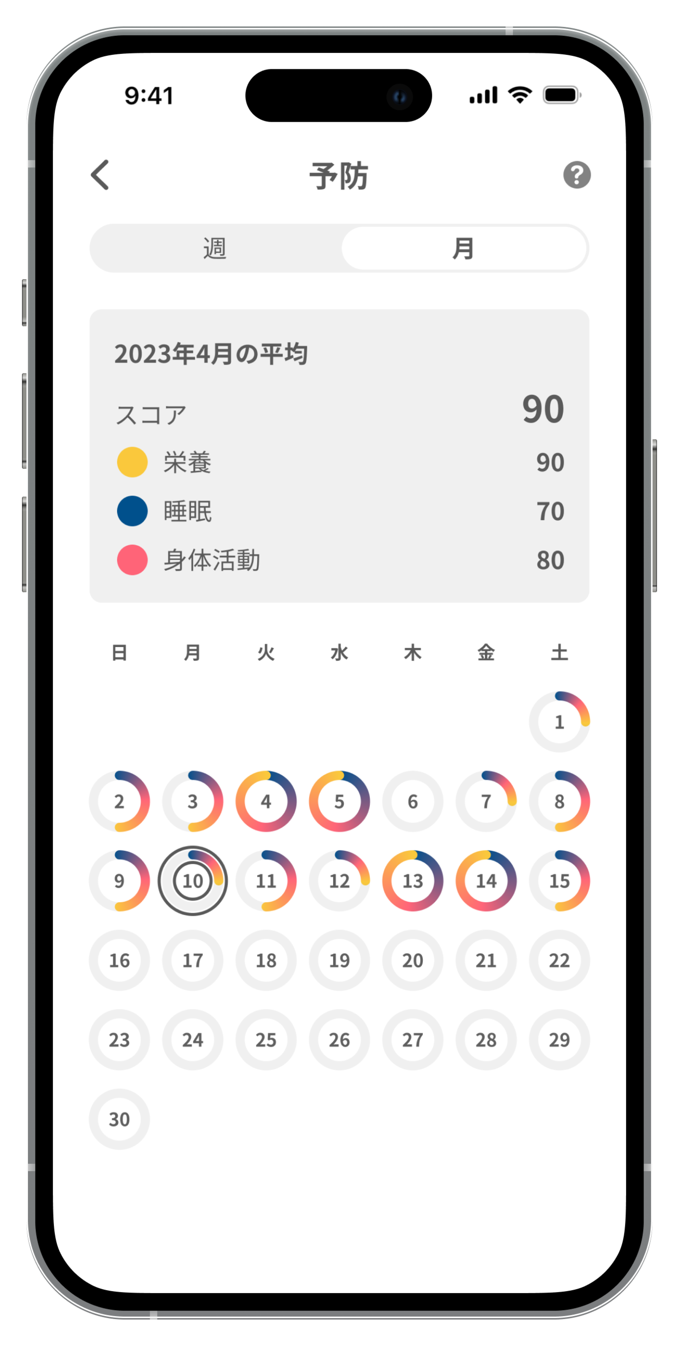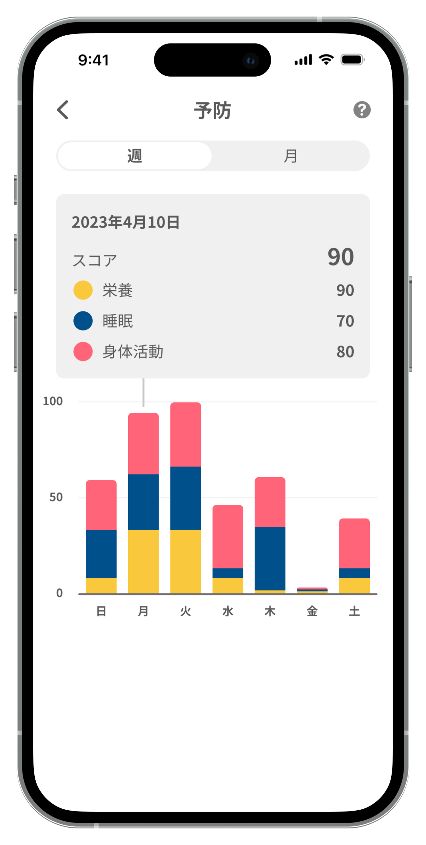栄養・身体活動・睡眠で記録されたスコアの平均値を算出し、昨日の生活がどのくらい生活習慣病の予防につながったかが可視化されます。