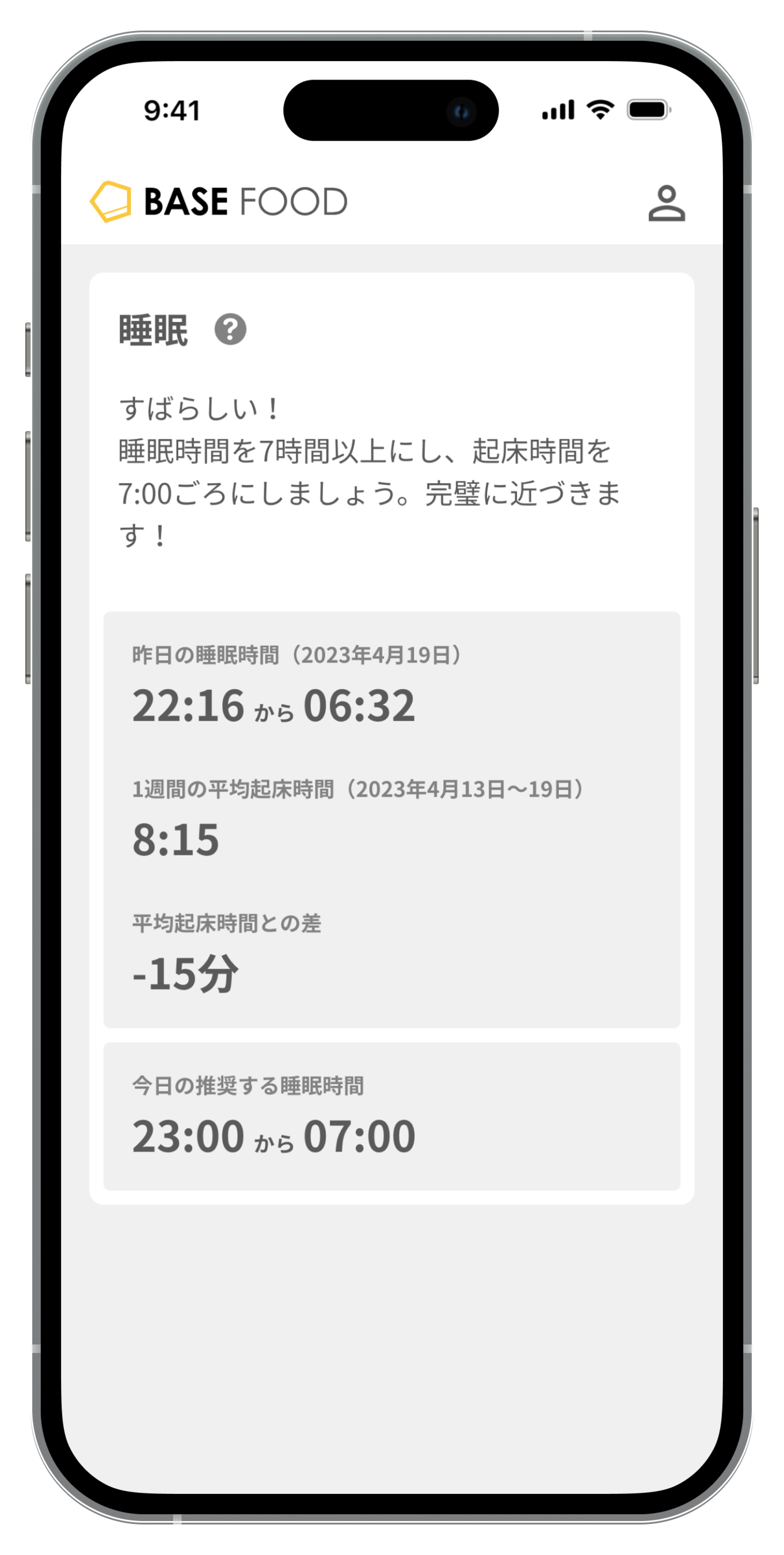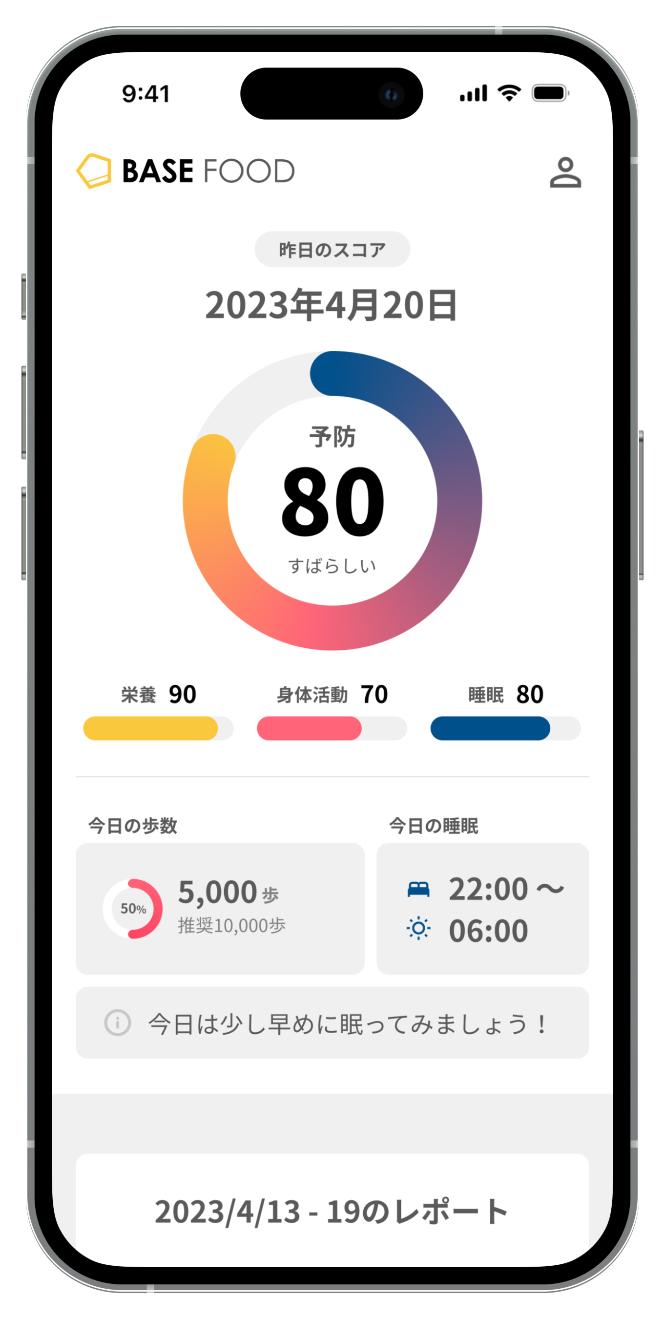「BASE FOOD ヘルスケア」は、生活習慣病の予防に重要な3つの要素である、栄養・身体活動・睡眠の情報を毎日自動で計測し可視化することで、ユーザーの長期的な健康維持をサポートすることを目的とした、 BASE FOOD 定期購入会員向けのアプリです。