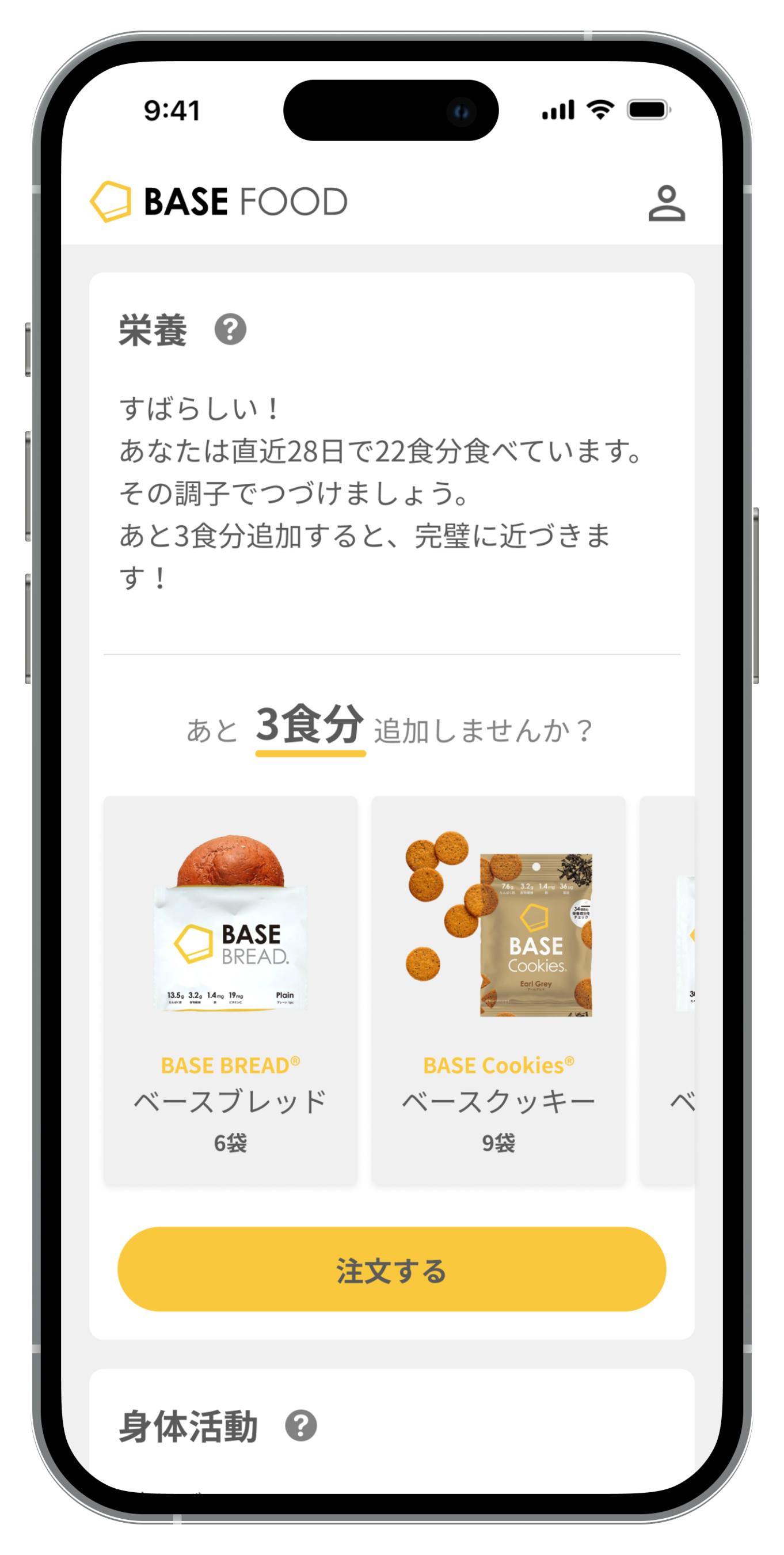 「BASE FOOD ヘルスケア」は、BASE FOOD定期購入会員のアカウントと連動しています。公式ECサイトでの注文時に、購入した食数をお届け日から28日間で均等に食べると想定した場合の1日あたりの食数からスコアが計算されます。