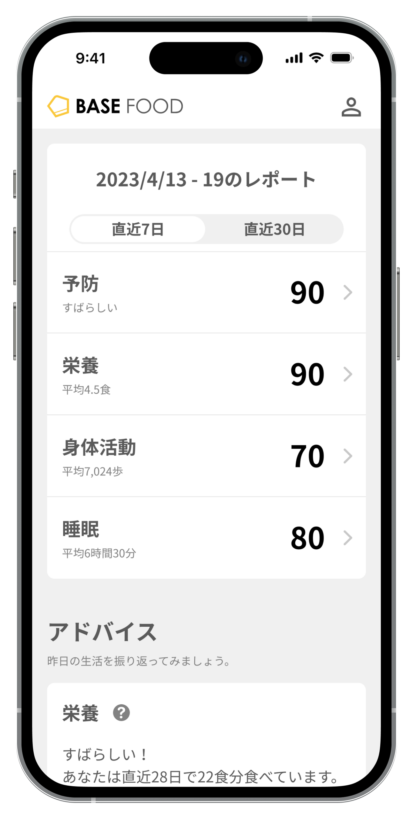 生活習慣病の予防のためには、毎日の積み重ねと習慣化が必要です。「BASE FOOD ヘルスケア」は、習慣化の壁となる“情報入力”の手間がありません。栄養・身体活動・睡眠の3要素を総合して予防スコアを把握でき、スコアの遷移グラフや、1週間/1ヶ⽉/3ヶ⽉/6ヶ⽉の平均値も確認することができます。また、改善のアドバイスもできるので、ユーザーが生活習慣病予防に効果的な習慣を身につけることを無理なくサポートします。