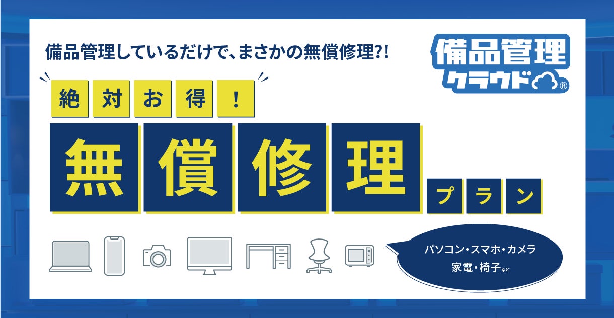 「備品管理クラウド」に登録するだけで、メーカー保証切れのIT機器・家電全般・オフィス家具・カメラ類などほとんどの備品の無償修理が可能に!