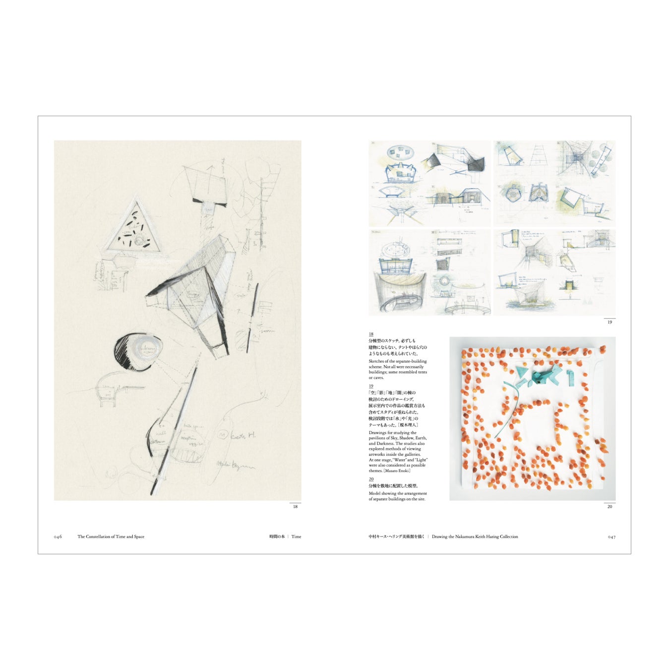 「空間の本」では、展覧会でインスタレーションを構成した6つの要素を軸に、北川原氏自身の言葉と数々の資料を通して建築のプロセスを紹介し、「時間の本」では、《中村キース・ヘリング美術館》竣工に至るまでの設計の変遷を、書き下ろしのテキストともにたどり、創造の源泉から実際の建築作品に至るまでのプロセスを公開。