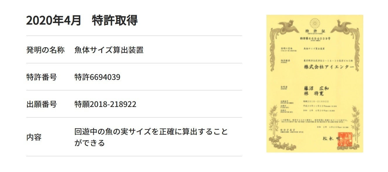 2020年4月に特許を取得した「魚体サイズ測定カメラ」はディープラーニングの画像認識技術によって魚体を検出し、魚の位置情報から魚の体長と体高のサイズを計測するシステムです。