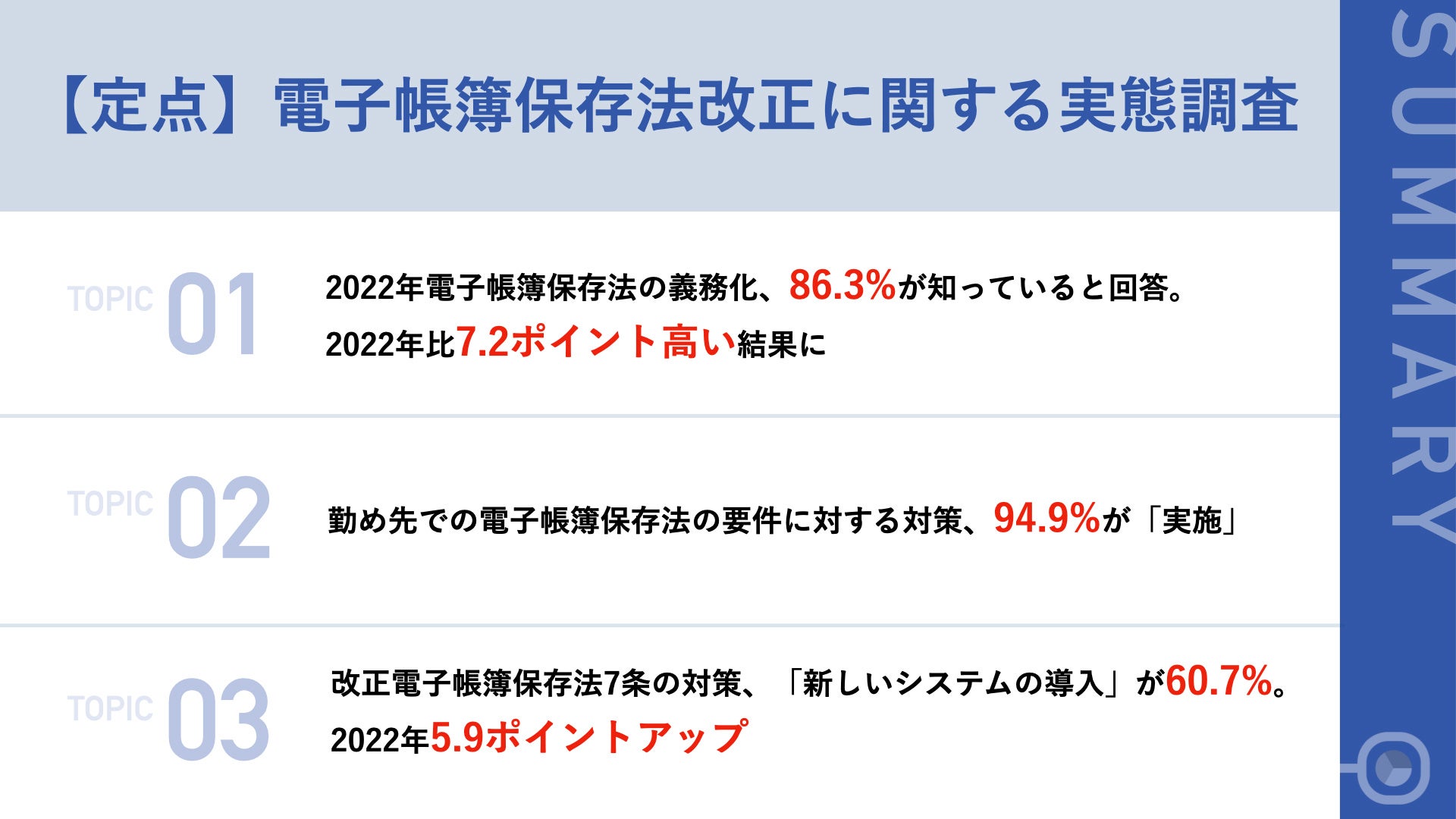 【2022年改正 電子帳簿保存法の対応状況を定点調査】電子帳簿保存法の義務化について、86.3%が「認知」2022年比7.2ポイントアップ