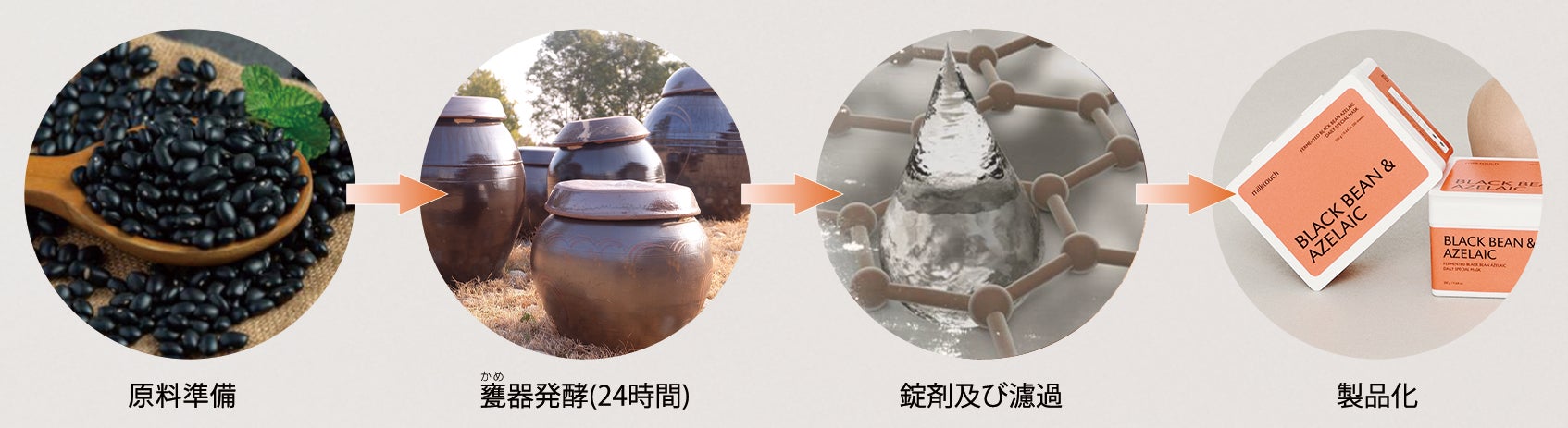 アゼライン酸*1は実は韓国では化粧品に配合することができない成分です。日本のクリニックから火がついた皮脂管理成分のアゼライン酸*1と韓国産の黒豆発酵エキス*2の同時配合は日本のトレンドと韓国の伝統が組み合わさり、叶いました。