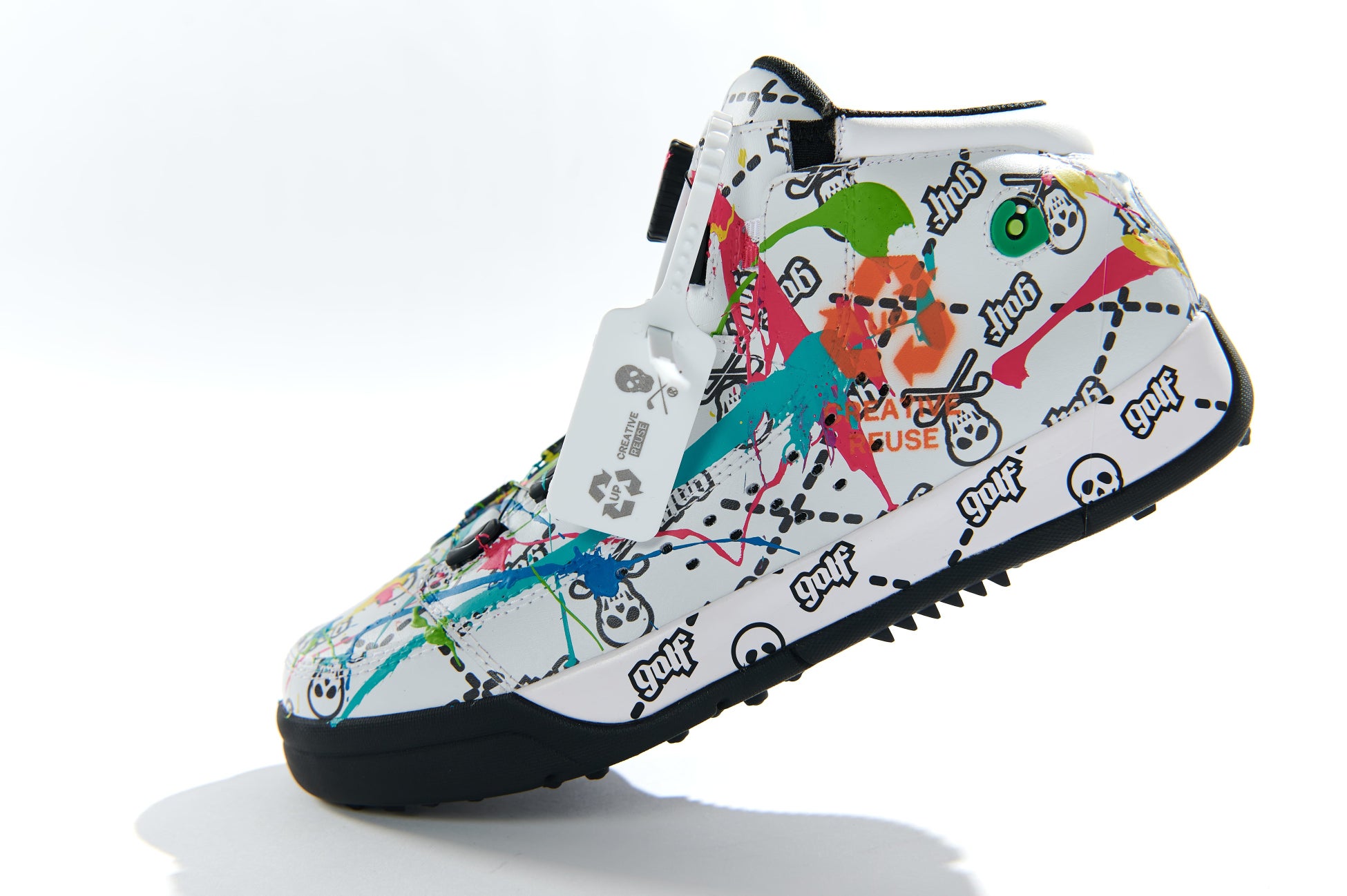 プリントミスや裁断ミスで残った素材を使用したクレイジーパターンのアッパーレザーに、アーティストによって一点ずつ異なるスプラッターペイントが施されたアップサイクルシューズ。同封されたリサイクルロゴ入りのパッカブルエコバッグに至るまで汚れシミなどにより廃棄された試作生地を再利用しています。