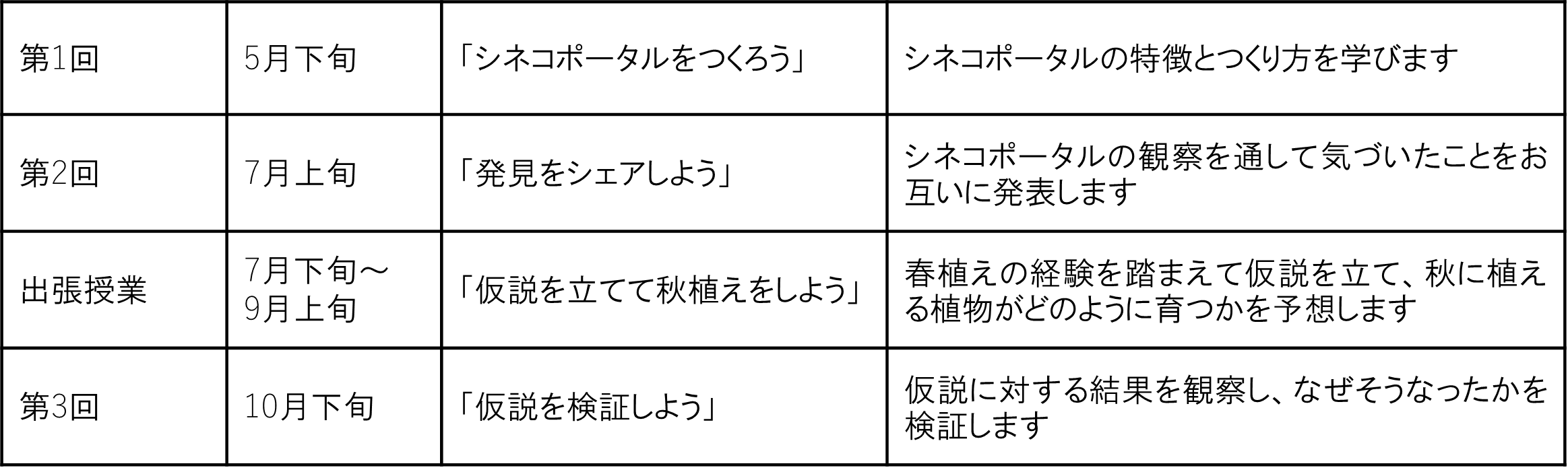 本ワークショップでは、全国各地の小学生に、約6ヵ月間シネコポータルづくりに挑戦してもらいます。子どもたちは、植物の成長やそこに生息する生物の観察記録をつけ、全3回のオンラインワークショップの中でそれぞれがつくったシネコポータルの成長について共有を行います。また、夏休み頃には各参加校へ出張授業を行います。