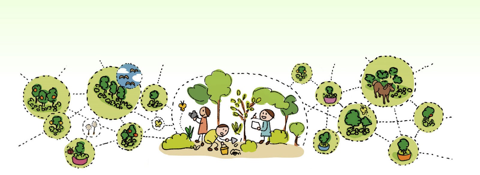 多様な植物や生物を観察する、収穫した果実や野菜を口にする、といった体験を通じて、自然の豊かさや生態系の存在を意識するきっかけをつくり、生物多様性を高めるために人間ができることは何か、子どもたちに考えてもらいます。