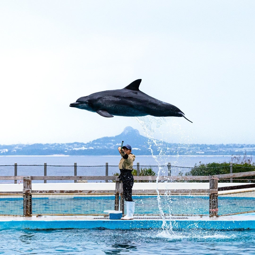 ミナミバンドウイルカの「オキちゃん」は、1975年に開催された沖縄国際海洋博覧会(EXPO'75)当時から飼育され、博覧会のテーマである「海~その望ましい未来」を象徴する存在として、イルカショーで観客を魅了しました。現在でも「オキちゃん劇場」で活躍しており、本種の国内最長飼育記録を更新し続け、たくさんの人びとに愛されています。