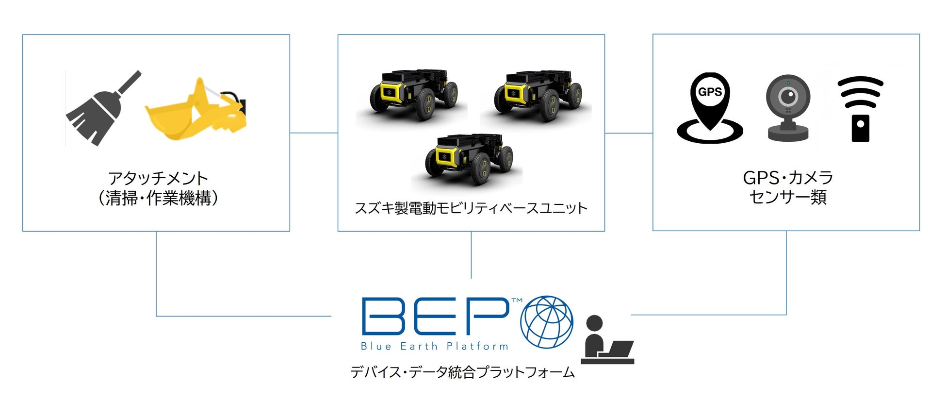 ブルーイノベーション株式会社(本社:東京都文京区、代表取締役社長:熊田 貴之、以下 ブルーイノベーション)は、スズキ株式会社の電動モビリティベースユニット※1を活用したUGV(無人地上車両)と、当社が提供するデバイス・データ統合プラットフォーム「Blue Earth Platform®(BEP)」※2技術の連携による、「スマートメンテナンス」※3の高度化を目指すプロジェクト(以下、本プロジェクト)を開始したことをお知らせします。