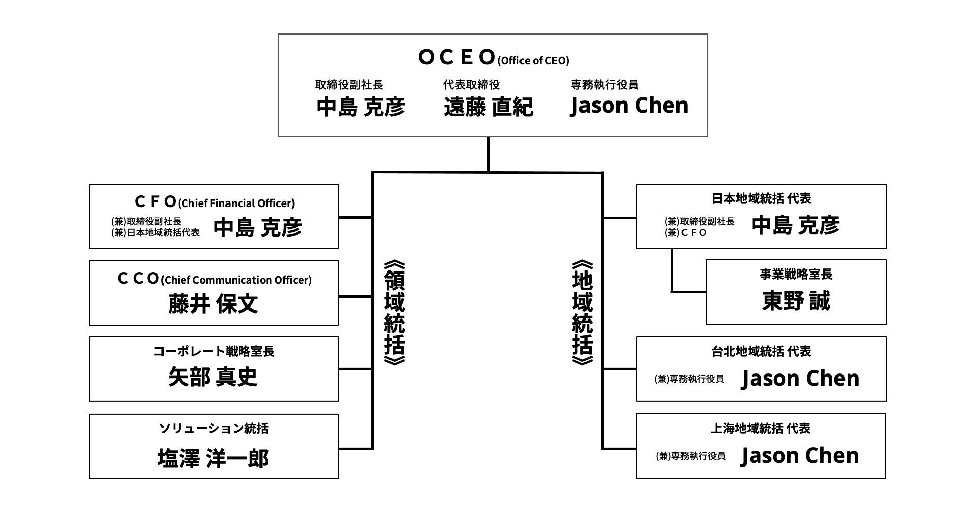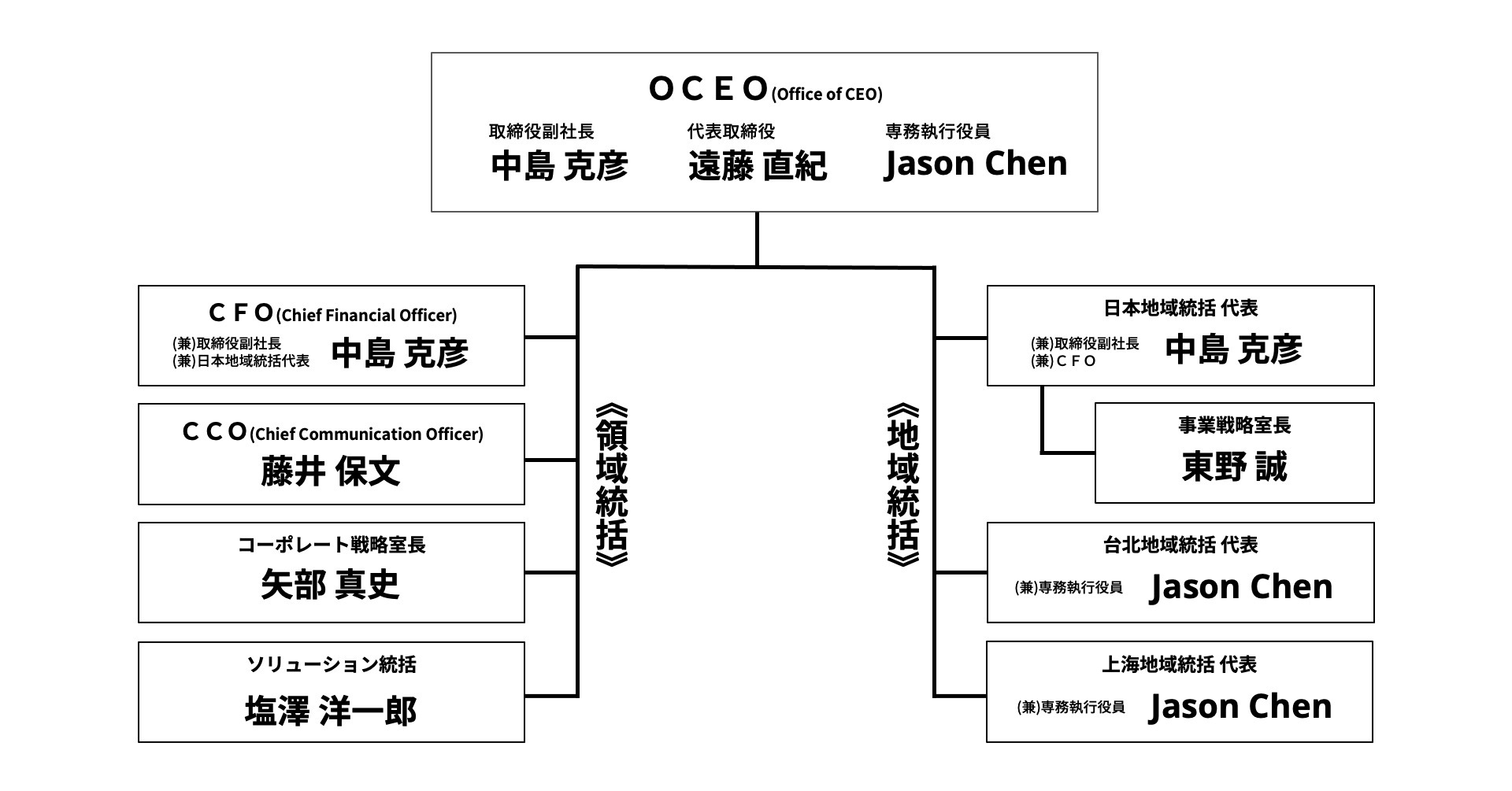 2022年1月に発表した台北・上海地域統括 代表 Jason Chenの専務執行役員就任(※1)、および台湾企業Omniscient Cloud Technologiesの株式取得(※2)に加え、この度の経営体制強化により、2022年以降に本格化するソリューション事業のグローバル展開に向け、必要な体制を構築しました。