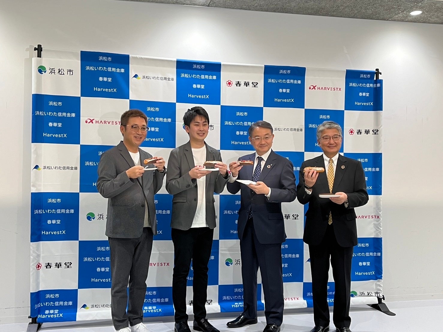 2024年11月8日(金)に浜松市内で開催し、自治体、メディア関係者などが参加しました。浜松市⻑ 中野祐介⽒、浜松いわた信⽤金庫理事⻑ 高栁裕久⽒、HarvestX 代表取締役 市川友貴氏、春華堂代表取締役 ⼭崎貴裕が支援体制や製品導入の背景等についてお話ししました。