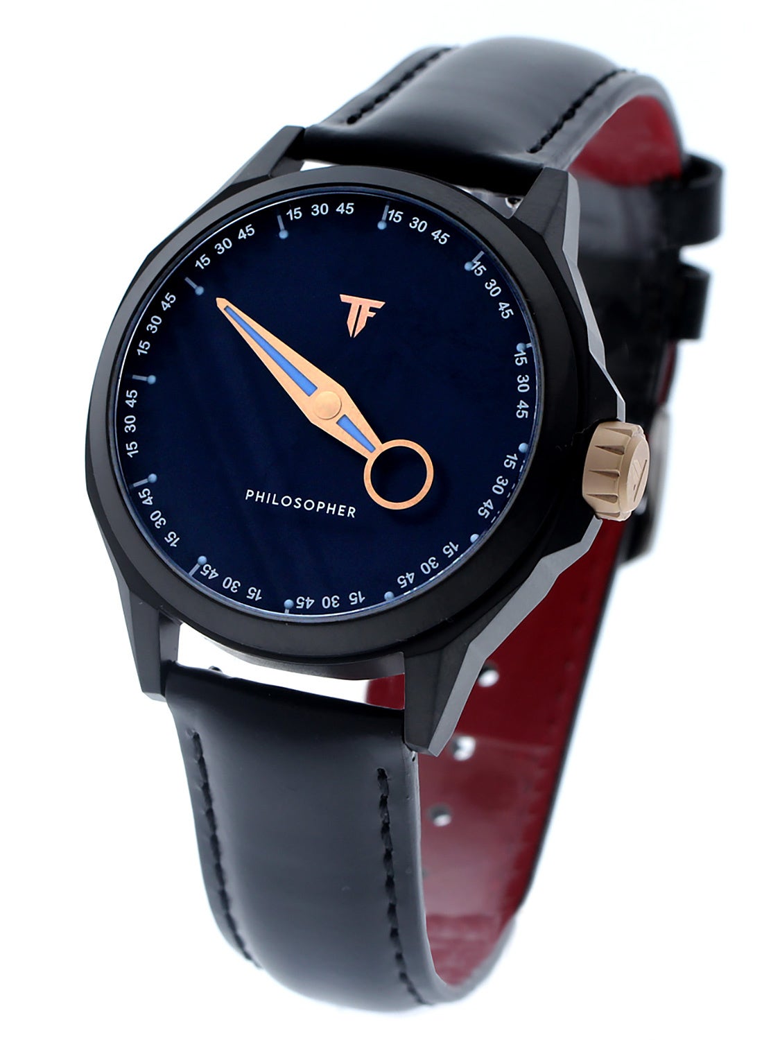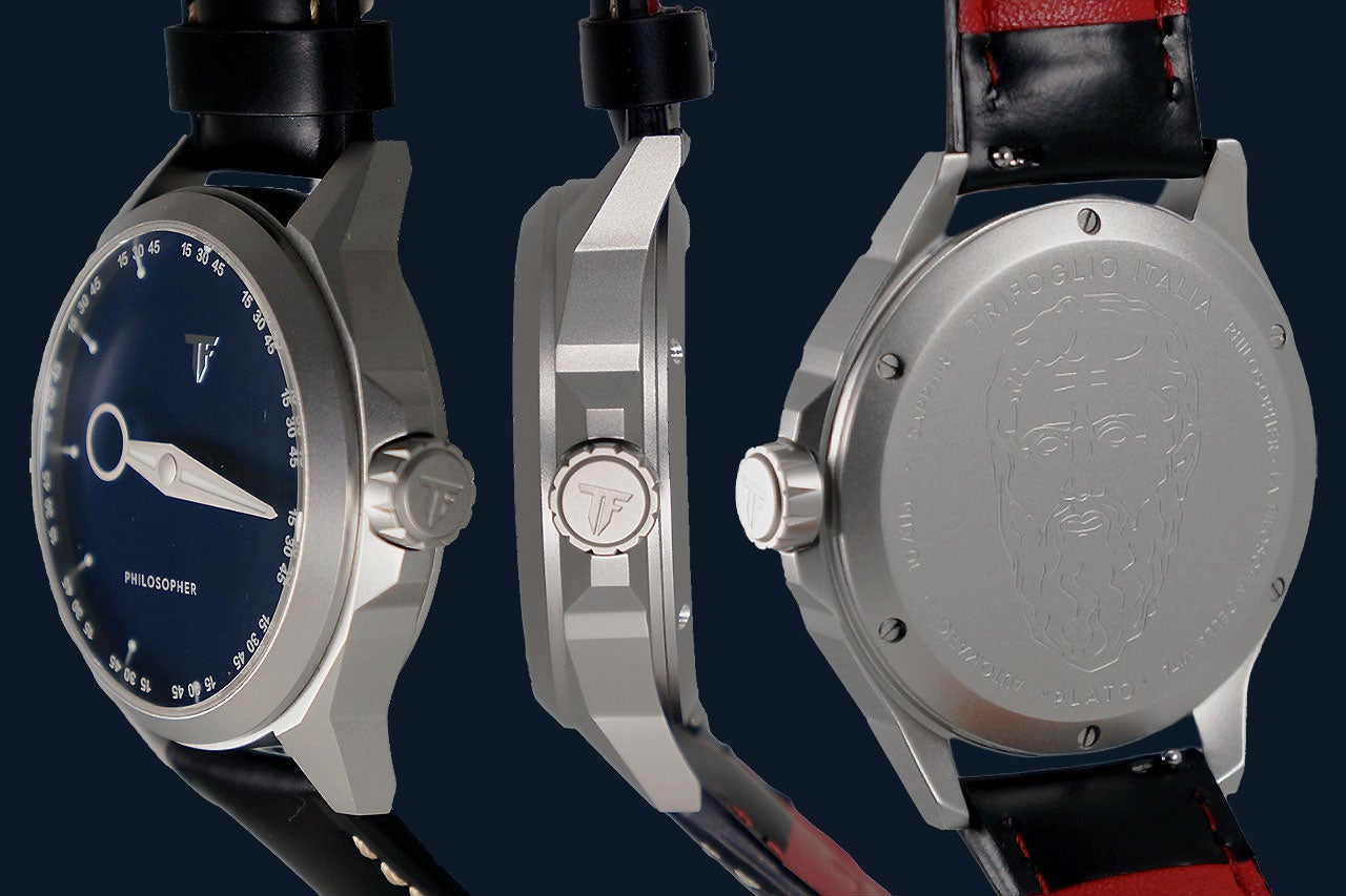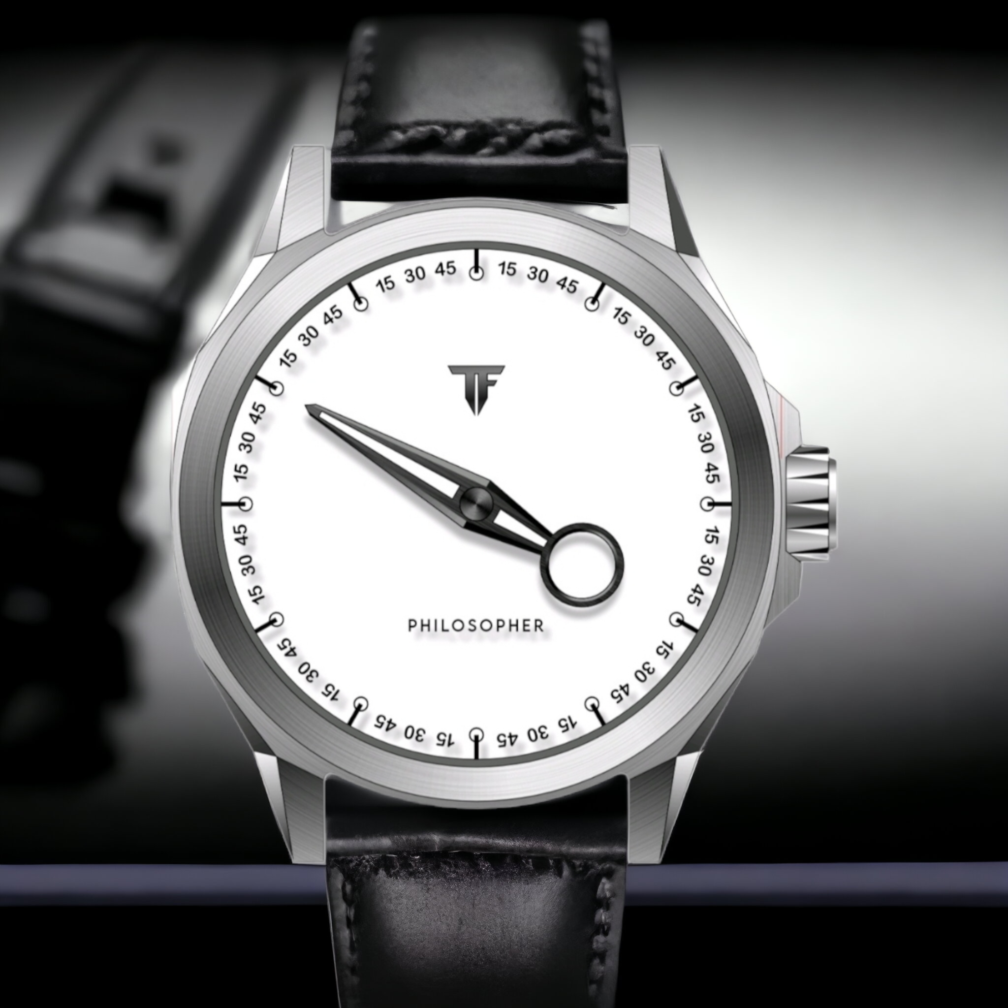 「フィロソファー」は、時間という概念を改めて考えさせ、見る者に知的遊戯を提案します。これは、ひたすら効率化が求められる現代社会において、ハイブランドからスモールブランドまで、多機能なクロノグラフウォッチが主流となっている腕時計市場に、あえて異彩を放つものです。こうしたモデルを大胆に打ち出すことが、トリフォグリオの持つ感性であり、哲学=フィロソフィーといえるでしょう。