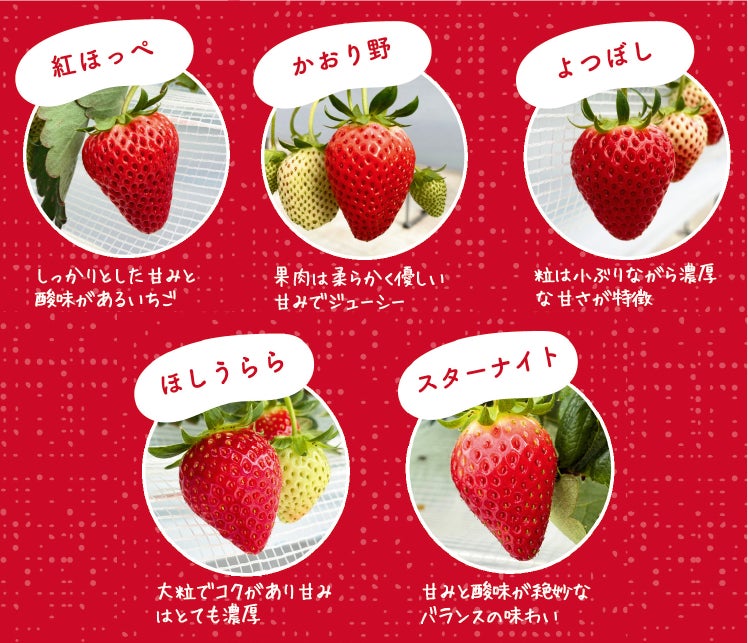(店頭販売で購入いただける品種、いちご狩りで食べていただける品種はその時々の育成状況により変動することもあります。)