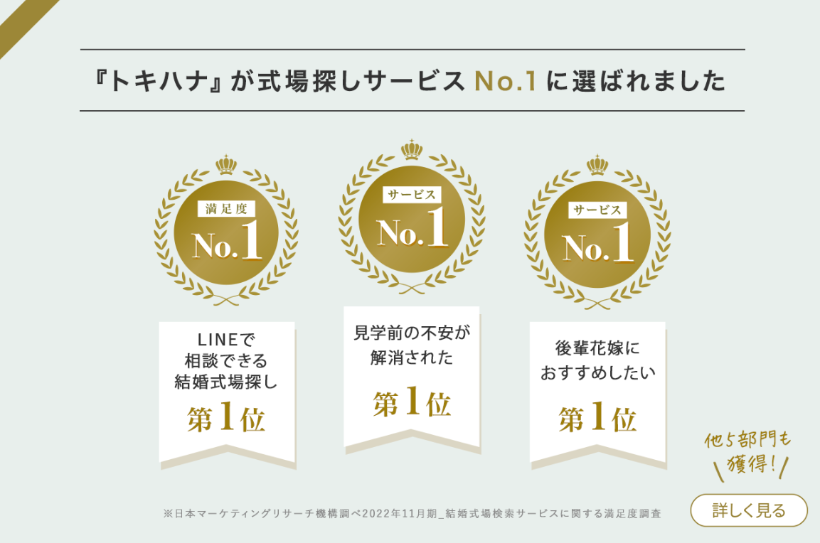 元ウエディングプランナーに22時まで何でも相談できます。結婚情報誌ではわからないリアルな見積もりや評判を知ることができ、こだわりを伝えたり様々な診断を通してピッタリの式場が手軽に見つかります。提携式場が厳選されていて、営業重視の式場はサービス対象外だから安心。トキハナからブライダルフェア予約をすると即決不要の最低価格保証・持込み自由・見積もりチェックなどのサービスが受けられ、よくある式場選びの失敗も回避できます。