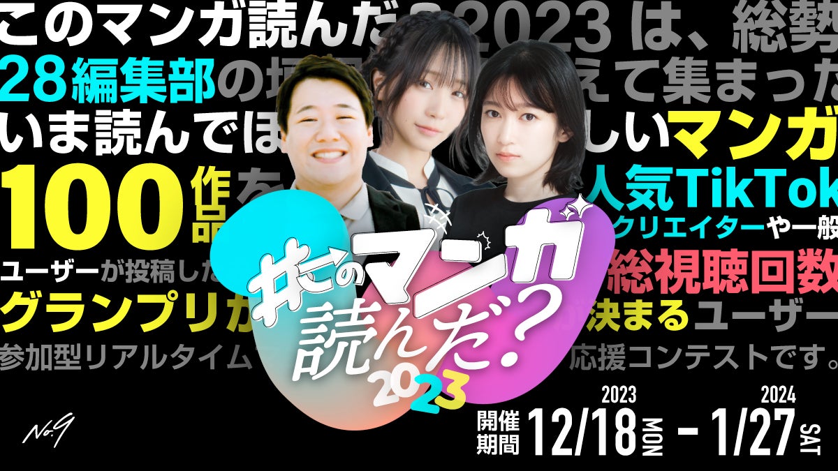 「このマンガ読んだ?2023」は、総勢28編集部の垣根を超えて集まった、いま読んでほしいマンガ100作品から、人気TikTokクリエイターを含むTikTokユーザーによるオススメ投稿の総視聴回数でグランプリを決めるユーザー参加型リアルタイムマンガ応援コンテストです。