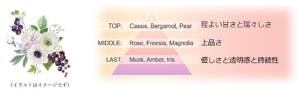 フルーティフローラルを基調に透明感と上品さのある香りを調香しました。お休み前のバスタイムに使用しても翌朝まで香りを楽しめる「持続性」を重視しました。
