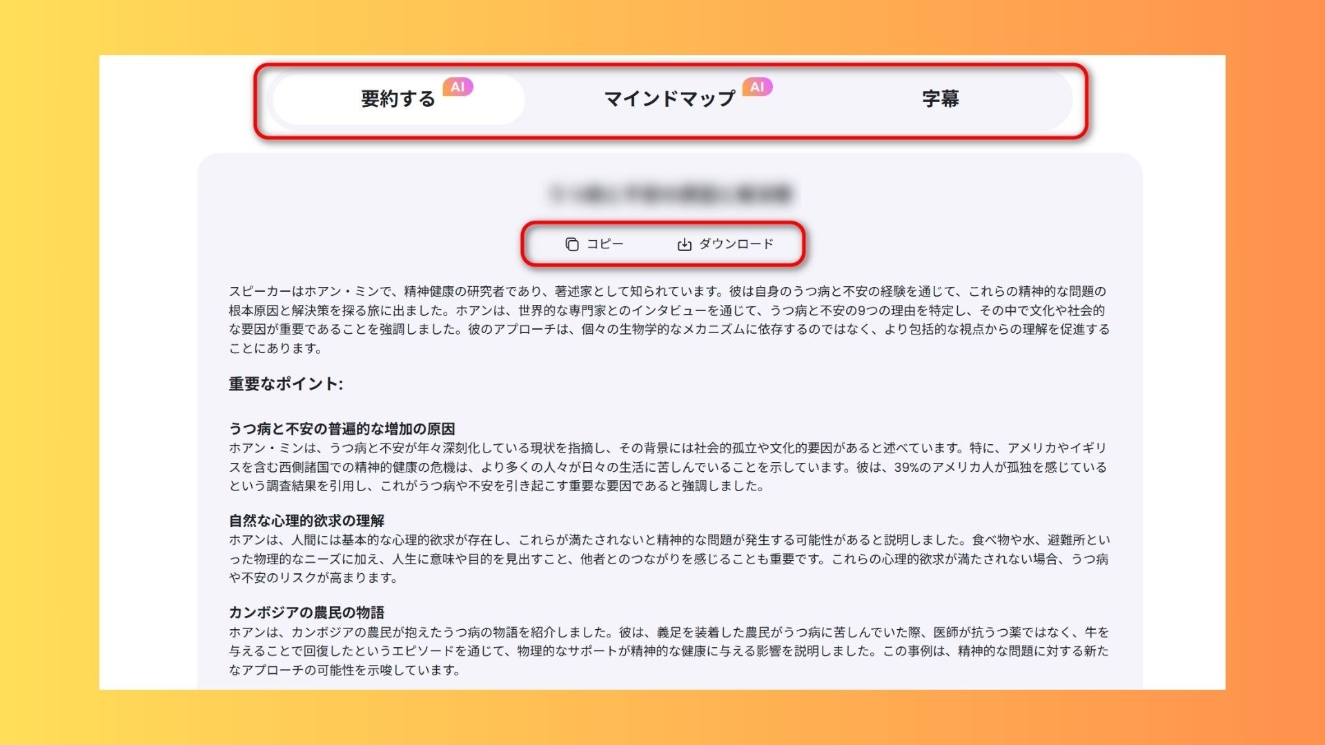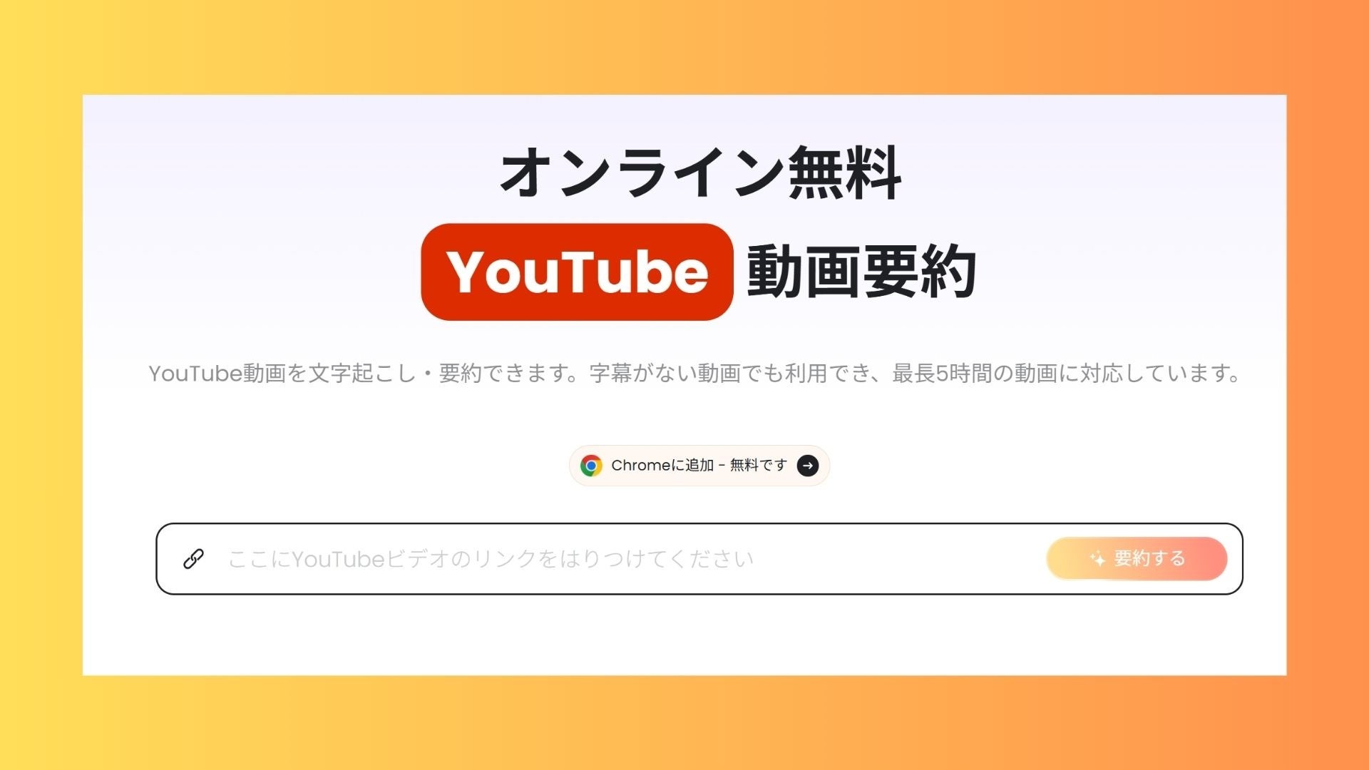 YouTube動画のURLを貼り付けるだけで、AIが動画の内容を自動で分析し、動画内容の要約を生成します。これにより、動画全体を視聴することなく、短時間で内容を把握することが可能になります。