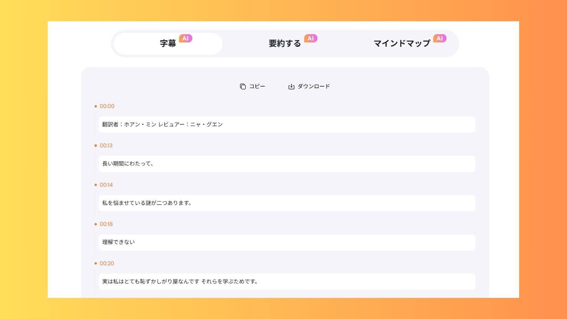 動画に付随する字幕データを簡単にダウンロードまたはコピーできます。多言語学習や、オフラインでの内容確認に便利です。